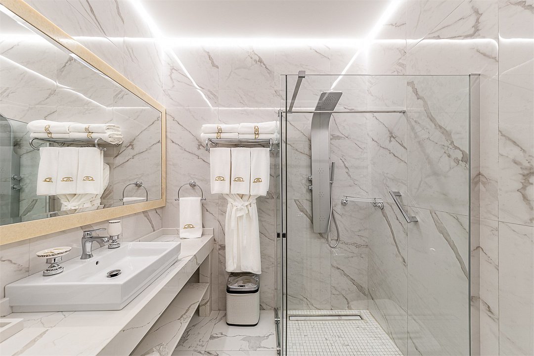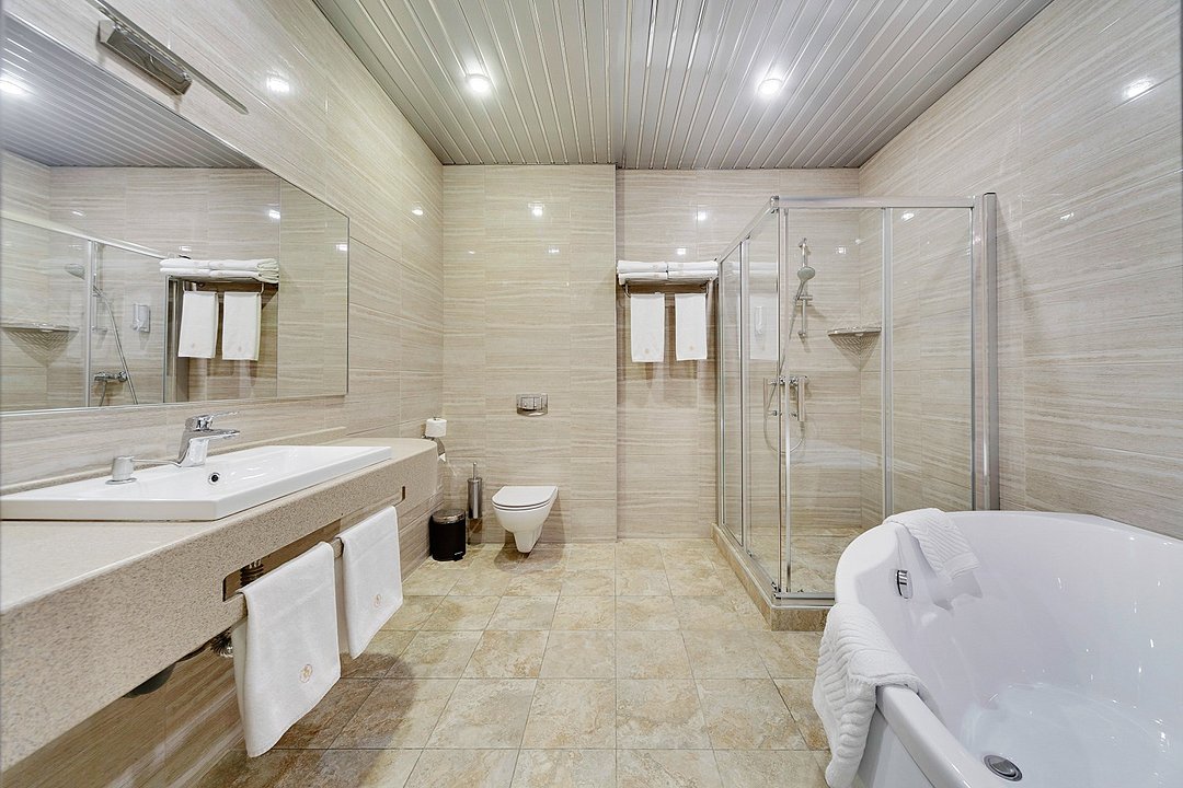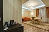 Wi-Fi, кондиционер, система безопасности, микроволновая печь, утюг, душевая кабина, санузел, биде, теплый пол, халаты, банные полотенца, тапочки, двуспальная кровать, гладильная доска, диван, шкаф для одежды, письменный стол, обеденный стол, багажная тумба, две комнаты, сейф, гостиная зона, вид на город, внутренний телефон, мини-холодильник, телевизор со Smart TV, номер для некурящих, чайная станция, туалетные принадлежности премиум-класса, бутилированная вода, без питомцевВ гостиничном номере