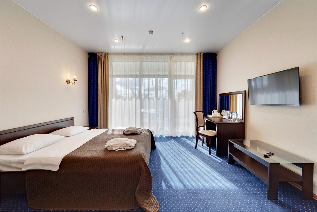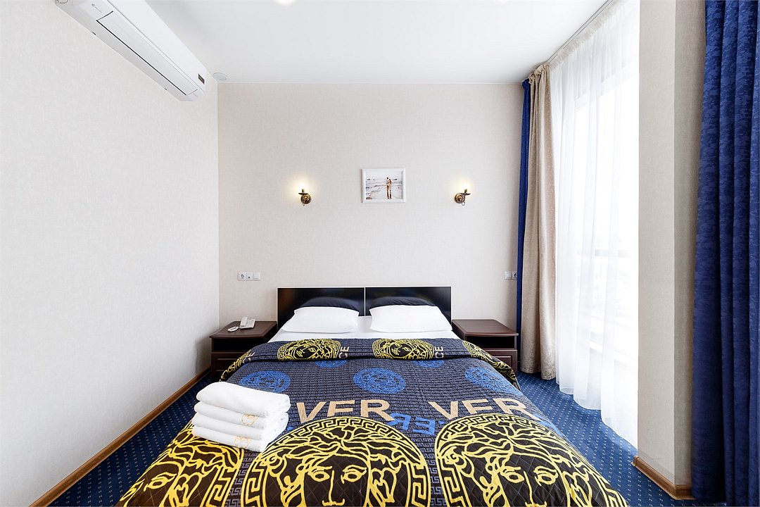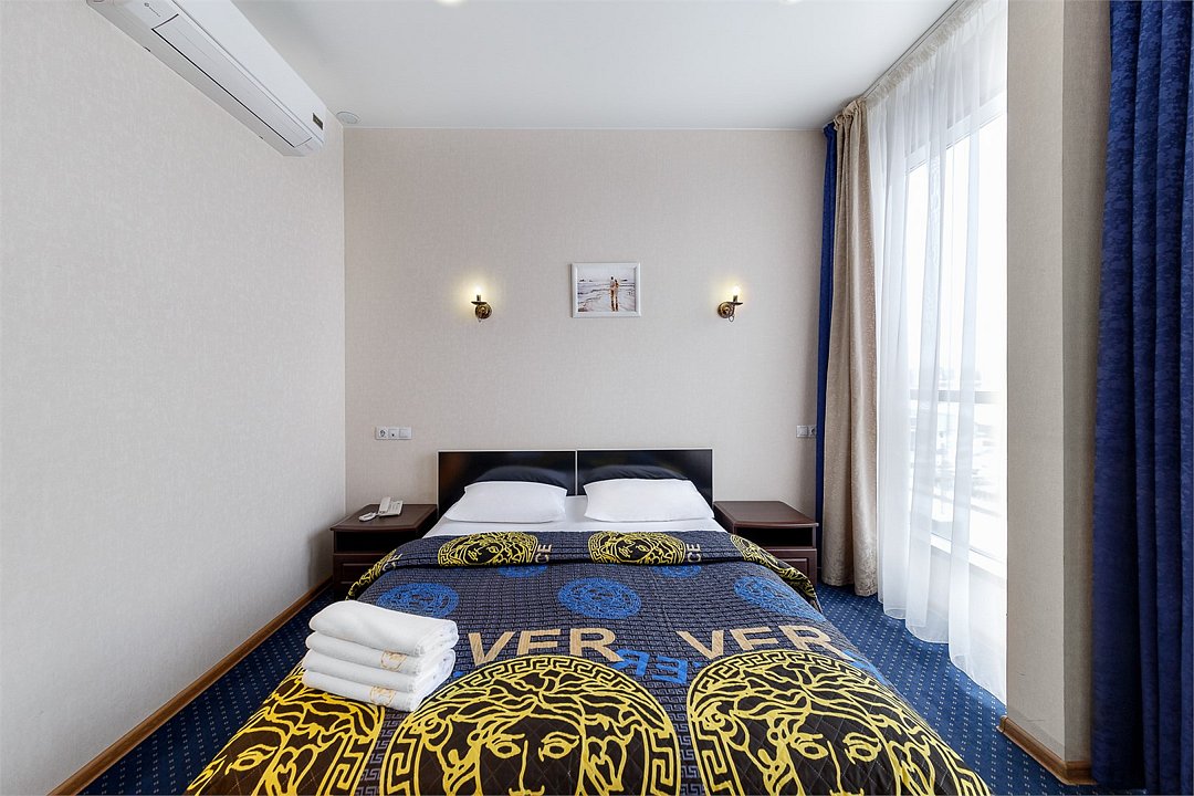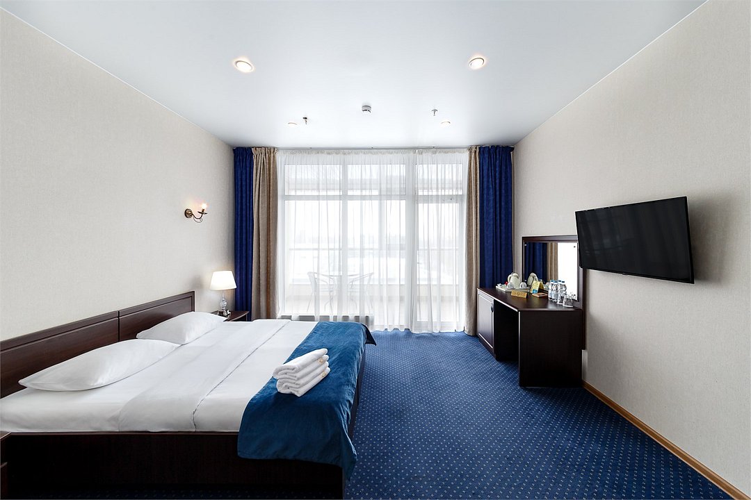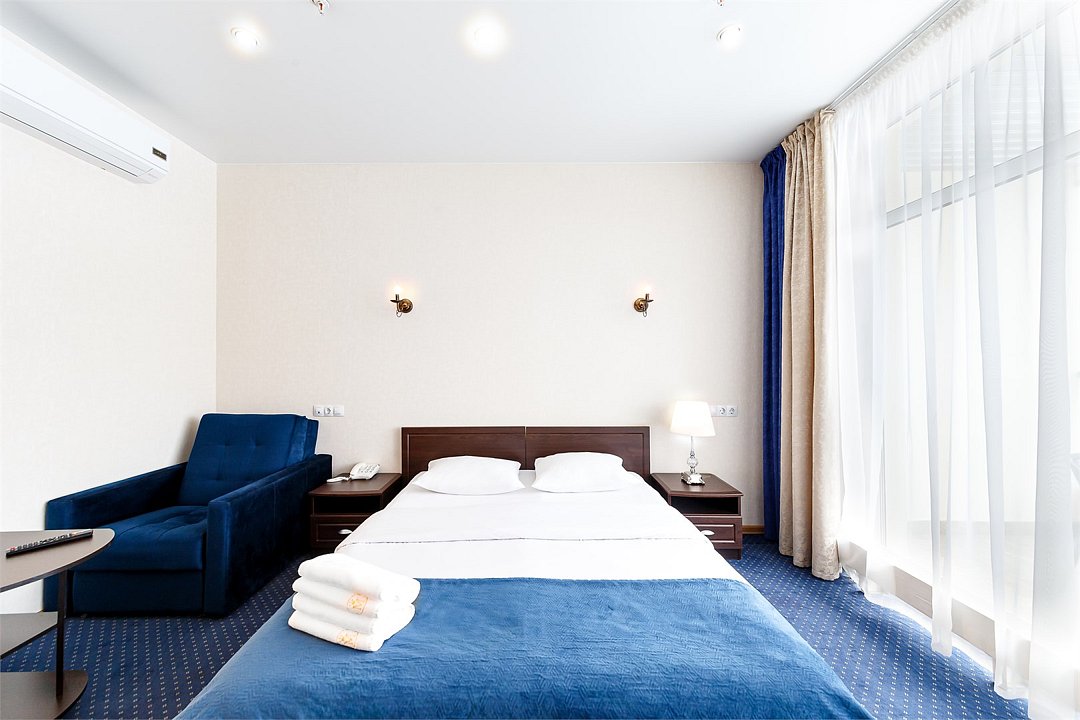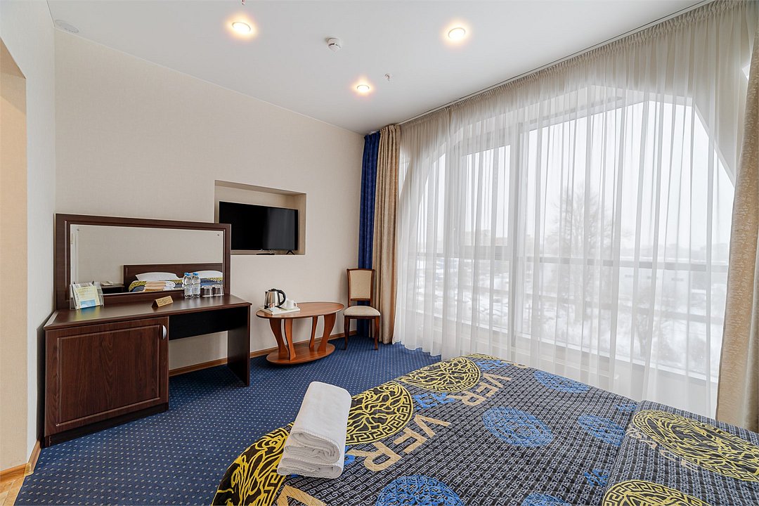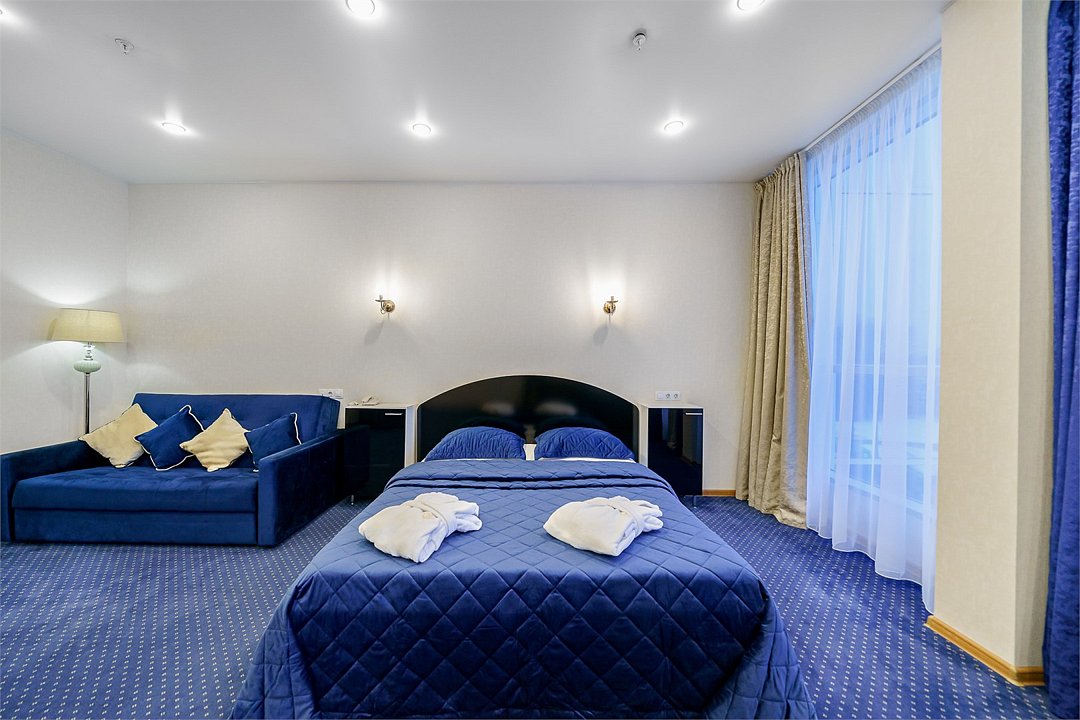 Просторный, светлый номер с панорамными окнами, оформлен элегантно в светло-бежевых-синих тонах. Площадь номера позволяет разместить дополнительное спальное место для ребенка или одного взрослого. Отличное решение для деловой поездки и комфортного отдыха.Услуги и удобства