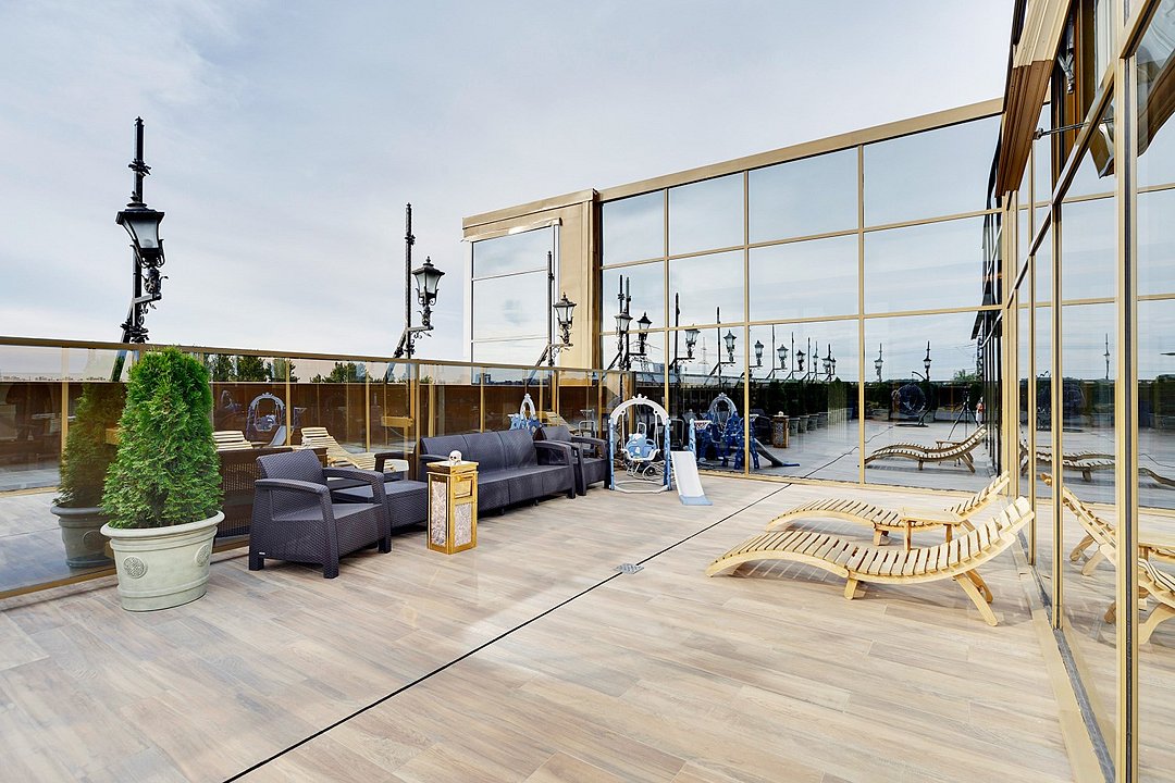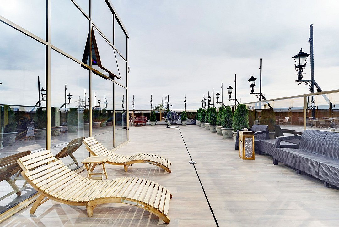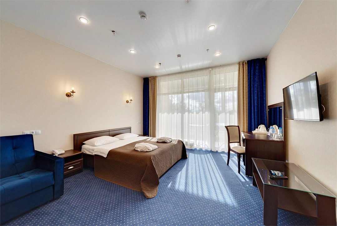 Wi-Fi, холодильник, кондиционер, фен, будильник, утюг, душевая кабина, ванна, халаты, банные полотенца, тапочки, косметические средства, балкон, две односпальные или большая двуспальная кровать, диван, шкаф для одежды, журнальный столик, письменный стол, багажная тумба, сейф, ковровое покрытие, кресло, вид во двор, туалетный столик, стол, панорамные окна, раскладное кресло, внутренний телефон, телевизор с плоским экраном, номер для некурящих, рабочий стол, холодильный шкаф, чайная станция, бутилированная вода, без питомцевВ гостиничном номере