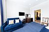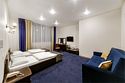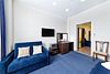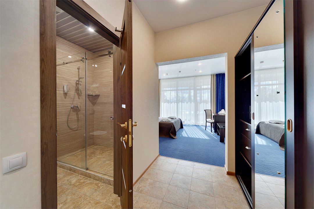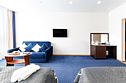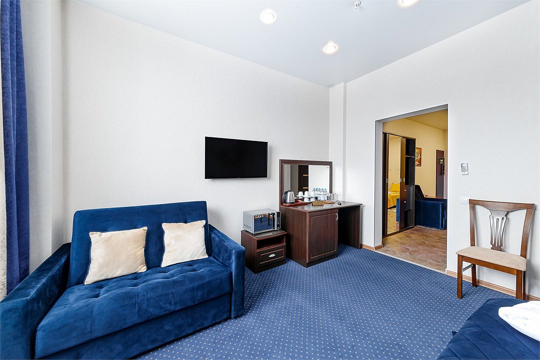 Двухкомнатный номер для 4 человек, идеально подойдет для семейной пары. В номере большая двуспальная кровать и две односпальные кровати, диван с креслом, два телевизора, туалетный столик с зеркалом, журнальный стол, ванная комната.Услуги и удобства
