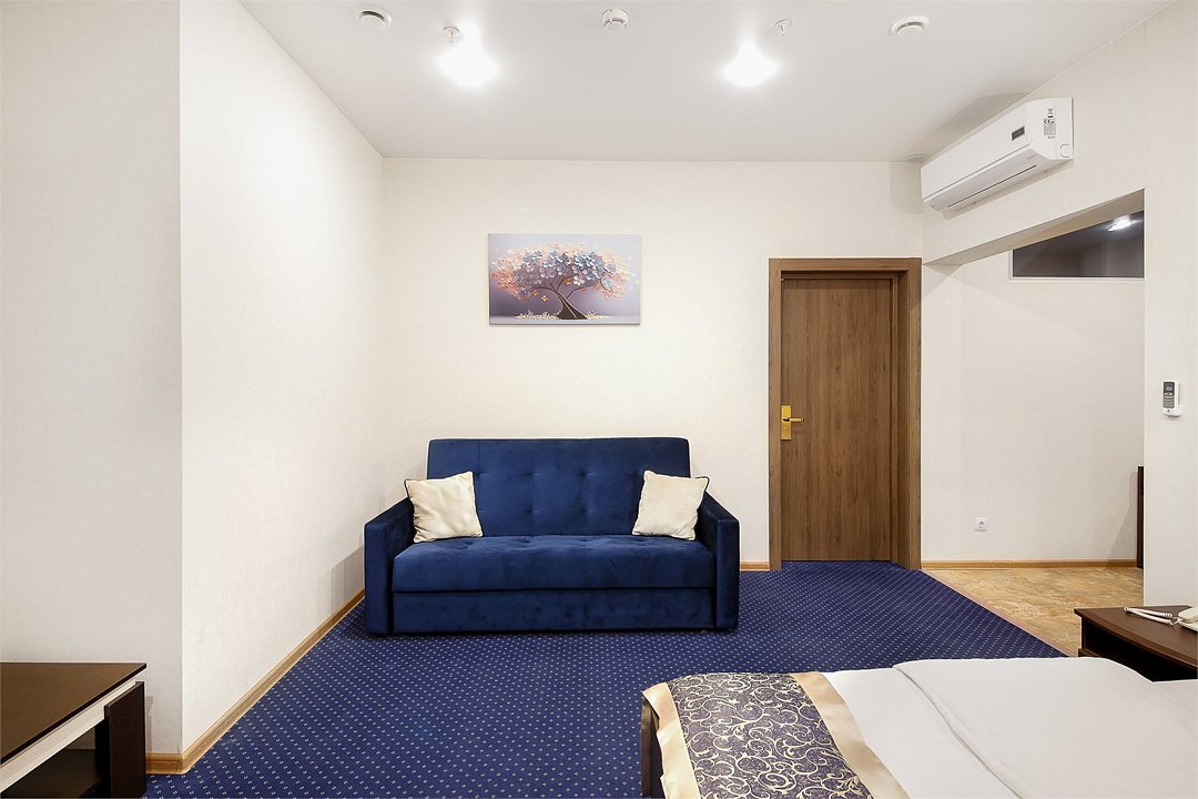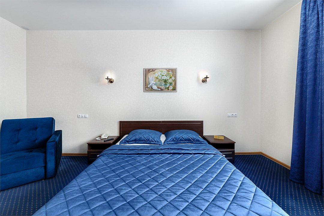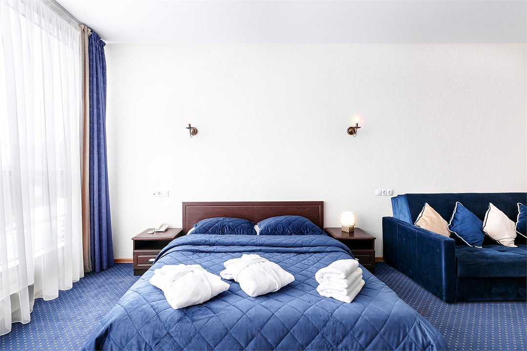 Светлый и просторный номер с большой двуспальной кроватью или двумя односпальными кроватями, диваном, письменный /туалетный стол с зеркалом, журнальный стол, ванной комнатой.Услуги и удобства