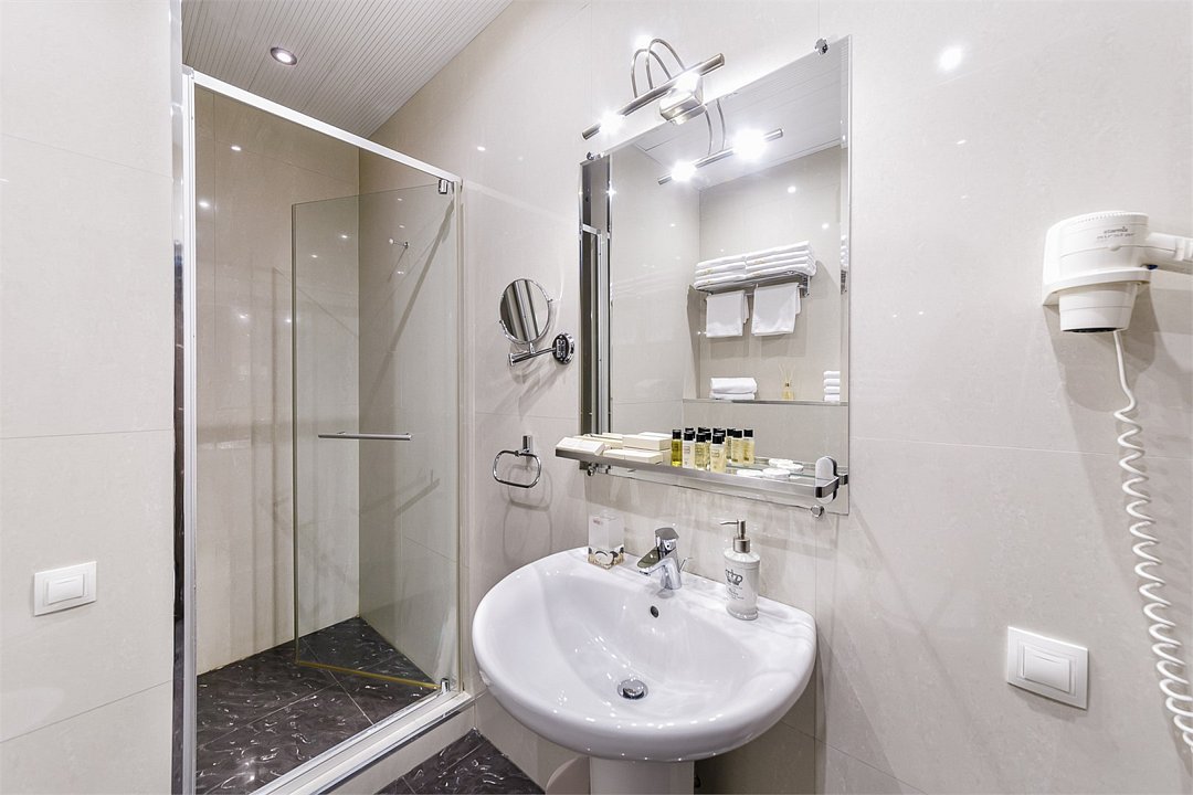 Wi-Fi, холодильник, кондиционер, фен, душевая кабина, банные полотенца, косметические средства, две односпальные или большая двуспальная кровать, шкаф для одежды, журнальный столик, письменный стол, багажная тумба, сейф, ковровое покрытие, вид во двор, туалетный столик, внутренний телефон, телевизор с плоским экраном, номер для некурящих, холодильный шкаф, чайная станция, бутилированная вода, без питомцевВ гостиничном номере