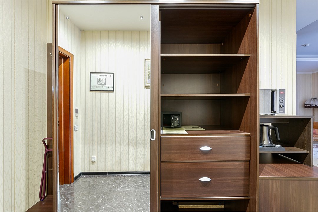 два телевизора, Wi-Fi, холодильник, кондиционер, фен, весы, микроволновая печь, утюг, душевая кабина, халаты, банные полотенца, тапочки, косметические средства, двуспальная кровать, две односпальные или большая двуспальная кровать, гладильная доска, диван, шкаф для одежды, журнальный столик, письменный стол, багажная тумба, две комнаты, сейф, ковровое покрытие, вид во двор, две ванные комнаты, туалетный столик, раскладное кресло, внутренний телефон, номер для некурящих, холодильный шкаф, чайная станция, бутилированная вода, без питомцевВ апартаментах