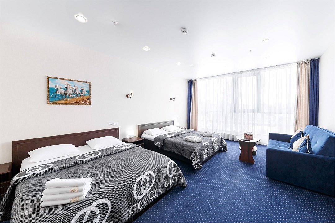 Wi-Fi, холодильник, кондиционер, фен, весы, душевая кабина, халаты, банные полотенца, косметические средства, две двуспальные кровати, диван, шкаф для одежды, журнальный столик, сейф, ковровое покрытие, вид на город, вид во двор, внутренний телефон, телевизор с плоским экраном, номер для некурящих, холодильный шкаф, чайная станция, бутилированная вода, без питомцевВ гостиничном номере