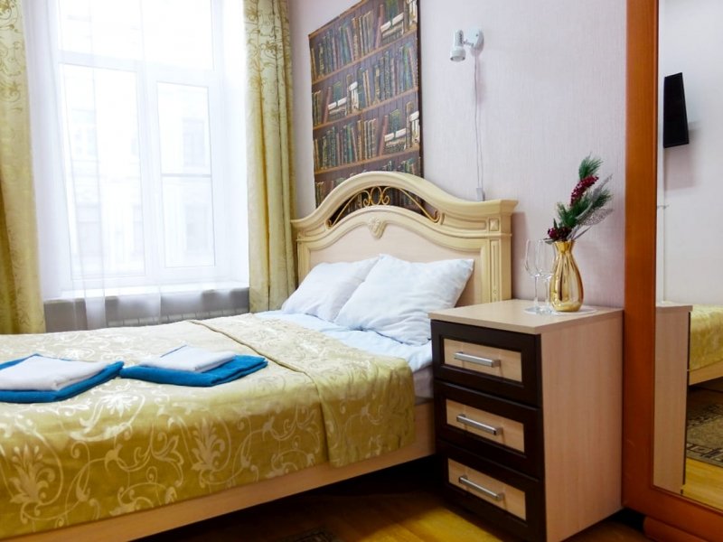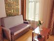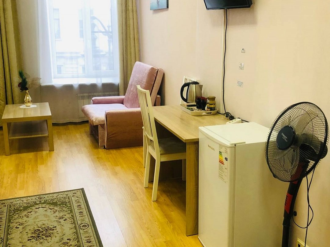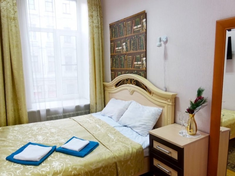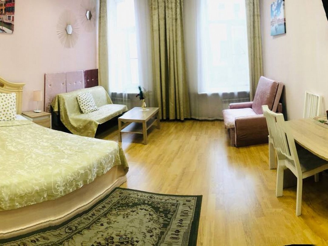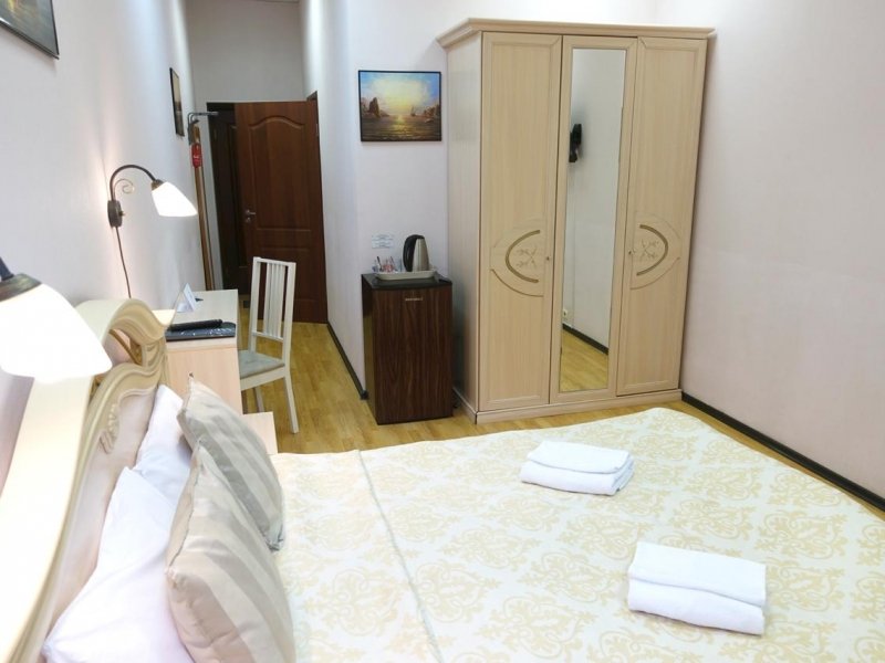Большой семейный номер площадью 41 м.кв., с одной большой двуспальной кроватью, раскладным диваном и раскладным креслом, с большим комфортом поместиться от одного до пяти человек, оснащен: прикроватными тумбочками, индивидуальным светом, двумя зеркалами в пол, мини-холодильником, электрическим чайником, посудой, телевизором с плоским экраном, вентилятор, собственной ванной комнатой с душевой кабиной, туалетом, умывальником с зеркалом, косметическими принадлежностями, феном. Два окна в номере выходит на Невский проспект, защищены москитной сеткой.В номере