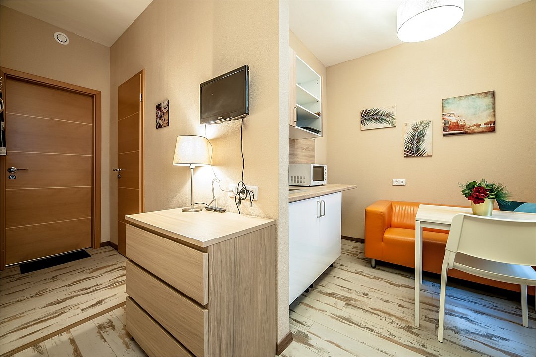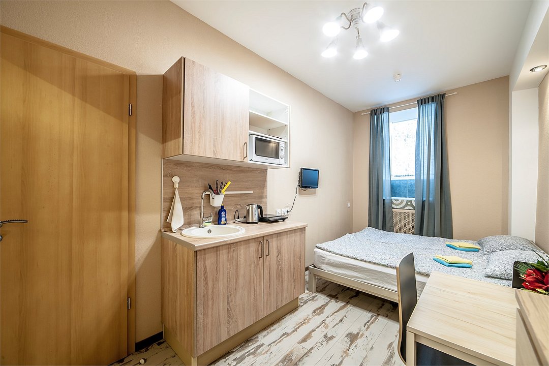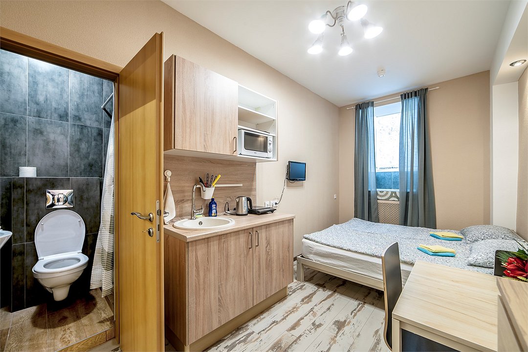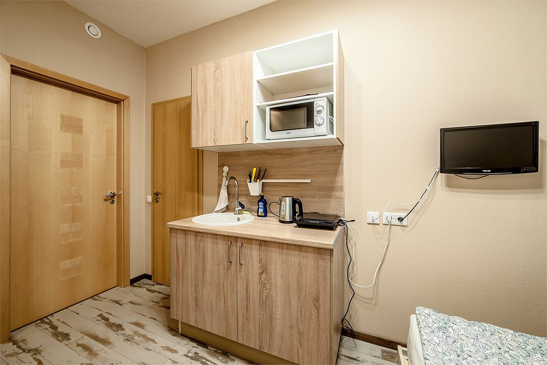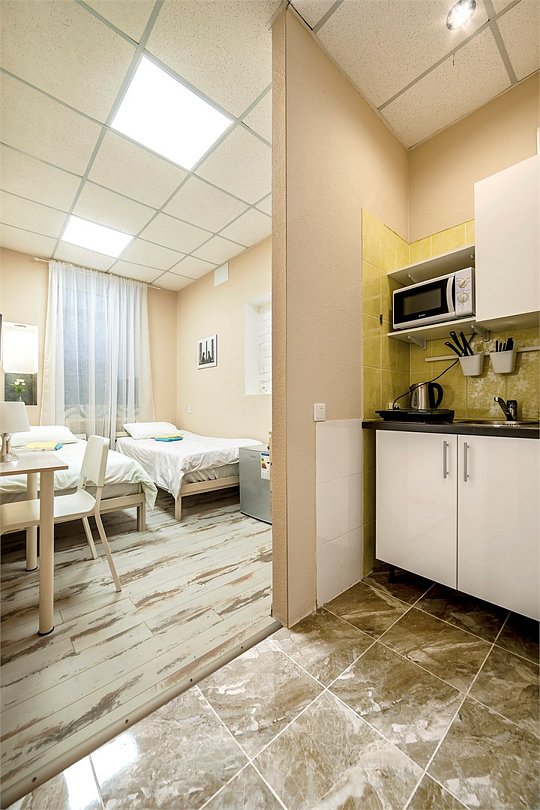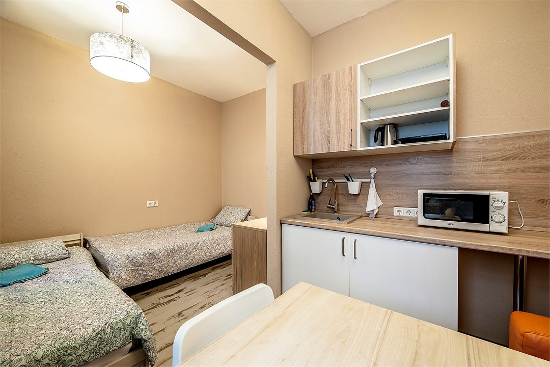 Номер студия с одной двухспальной + односпальная кровать или 3 односпальными кроватями . кухонной зоной и собственным санузлом.Услуги и удобства