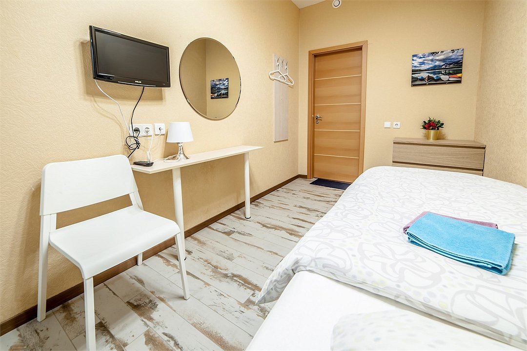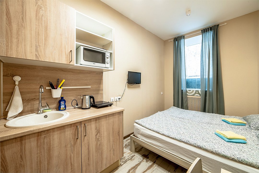 телевизор, Wi-Fi, холодильник, светильник, фен, микроволновая печь, утюг, ванная комната, водонагреватель, банные полотенца, тапочки, две односпальные или большая двуспальная кровать, вешалки, письменный стол, комод, чайник, раковина, отопление, вид во двор, стул, туалетные средства, мини-холодильник, мини-кухня, фумигатор, услуги прачечной (платно), без питомцевВ номере