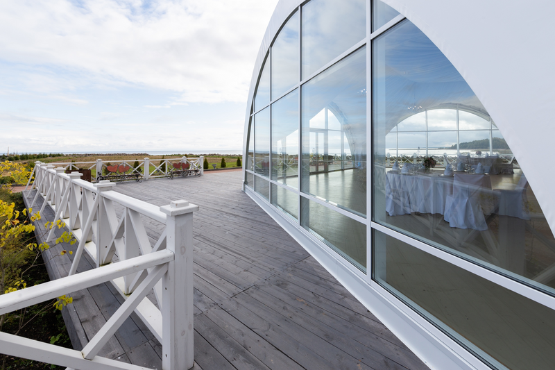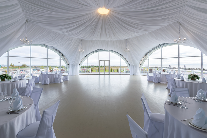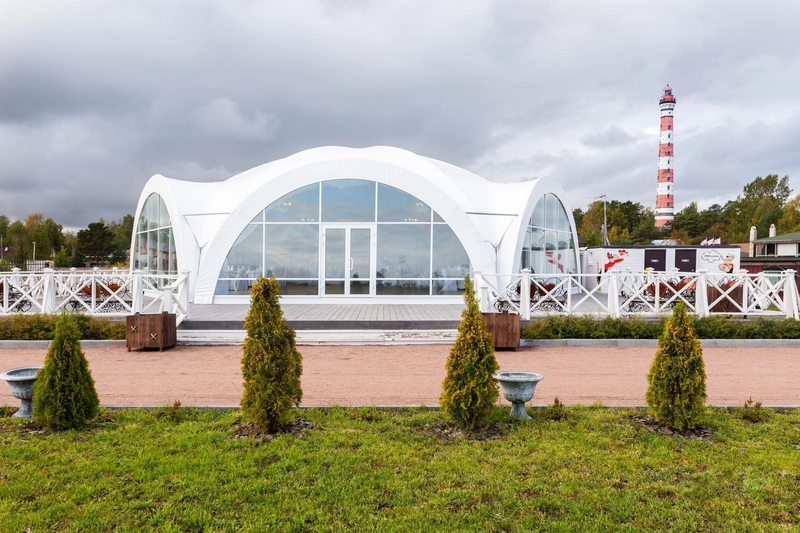 Полукруглые оконные арки пропускают в шатер много света, что делает пространство светлым и просторным. Сквозь окна открывается вид на яхт-клуб около Ладоги и бескрайнее небо с великолепными закатами. В том числе, нашей изюминкой является Осиновецкий маяк, расположенный в шаговой доступности. Старинный действующий маяк добавляет особого шарма в атмосферу этого места.
