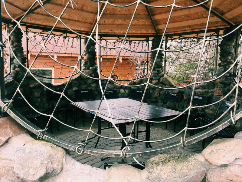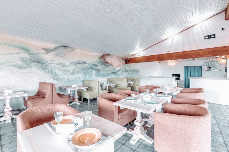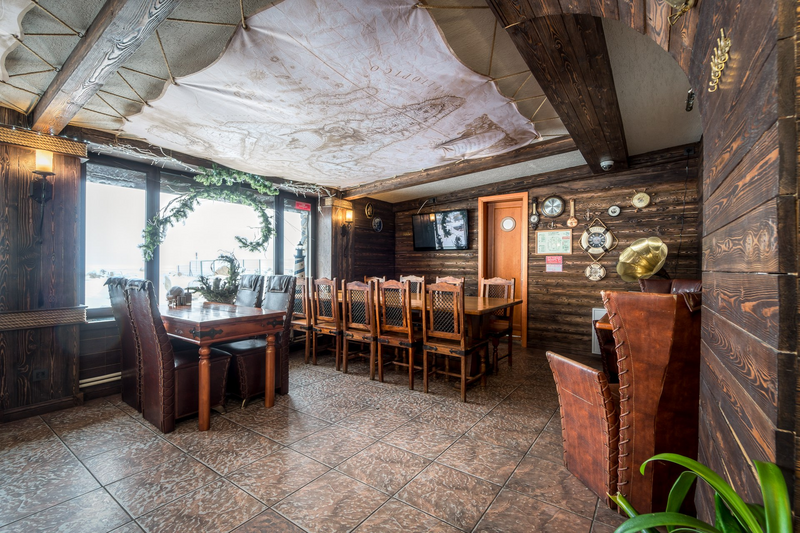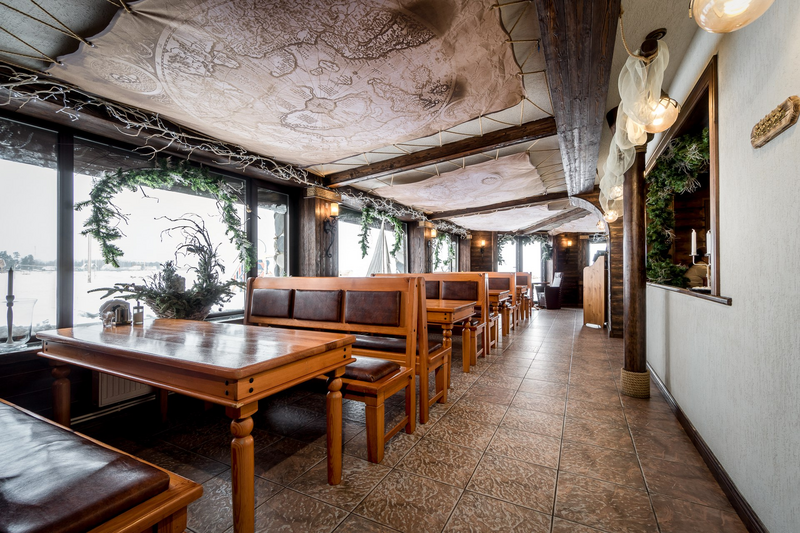 Оформление кафе выдержано в морском стиле, будто бы Вы находитесь на старинном корабле, скользящем по волнам. А через огромные окна, вдоль которых расставлены столики, можно насладиться видом Ладоги, песчаного пляжа и бескрайнего неба.