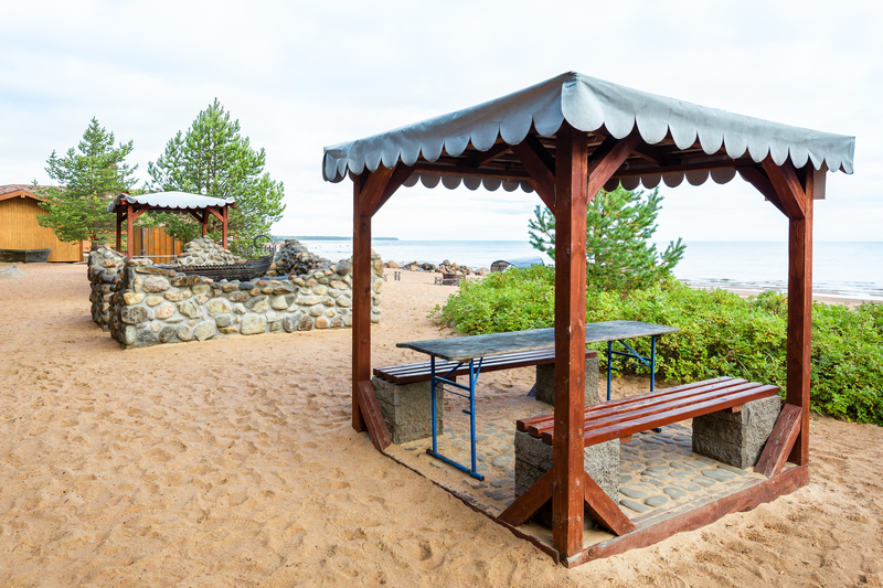 Беседка на пляже закрытая (в беседке стол, лавочки, мангал рядом):