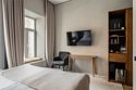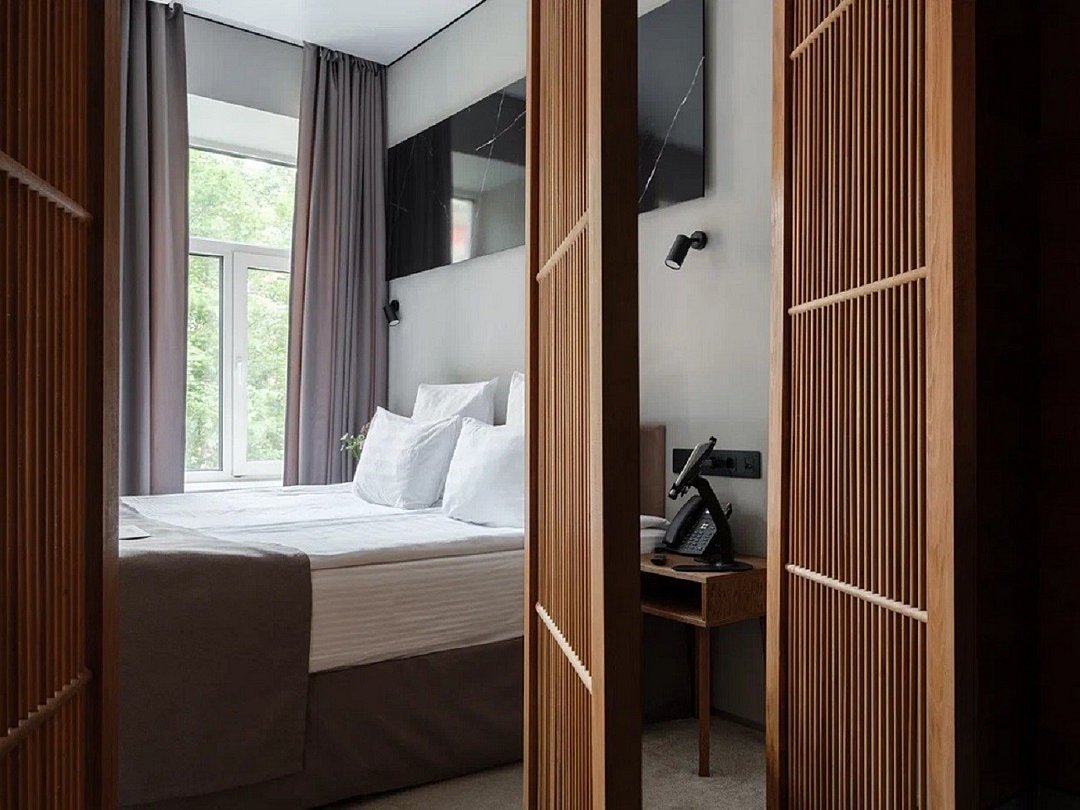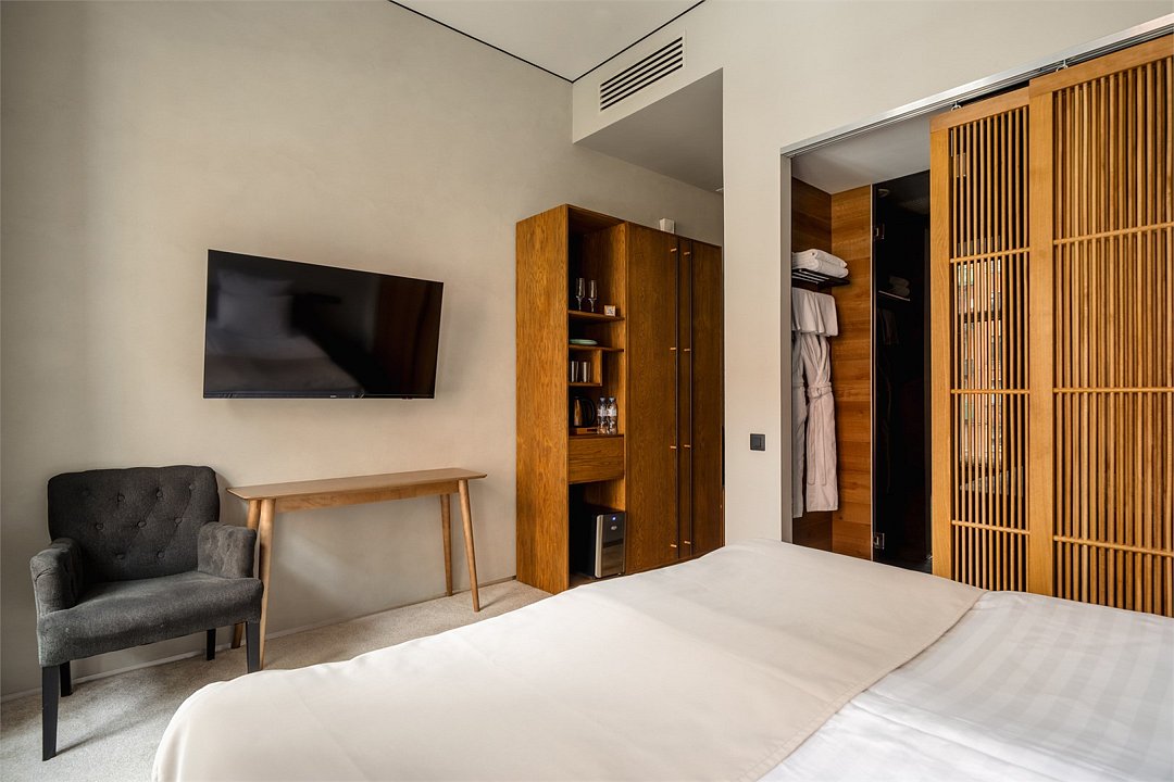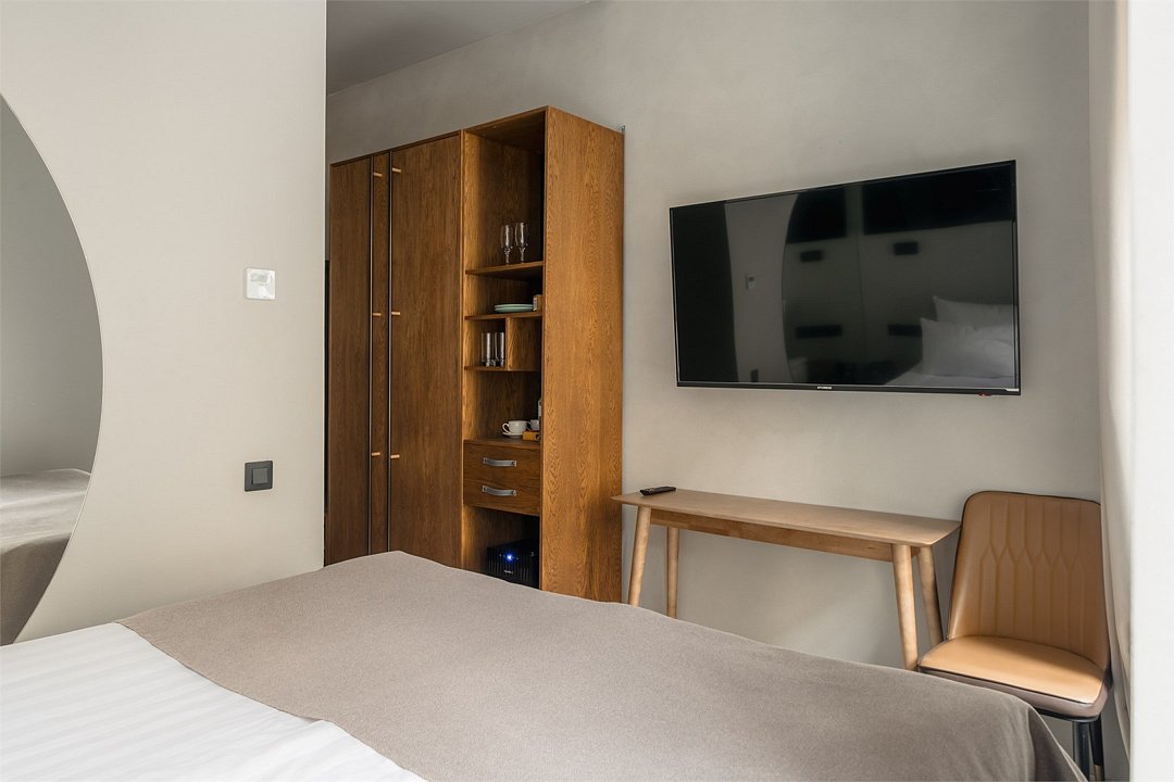 Wi-Fi, интернет, телефон, фен, система безопасности, электронные замки, утюг, банные принадлежности, халаты, тапочки, гигиенические средства, косметические средства, двуспальная кровать, тумбы, шкаф для одежды, зеркало, звуконепроницаемые стены и окна, обслуживание номеров, сейф, унитаз, раковина, ковровое покрытие, душ, вид на город, вид во двор, высокие потолки, столовые приборы, туалетные средства, туалет, сплит-система, мини-холодильник, телевизор со Smart TV, теплые полы, номер для некурящих, чайная станция, уборка номера, бутилированная вода, мыло, затемняющая штора, можно с питомцами, лежанка, мискаВ гостиничном номере