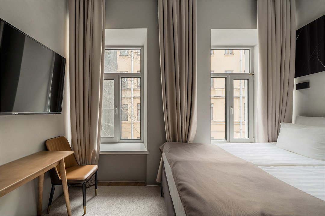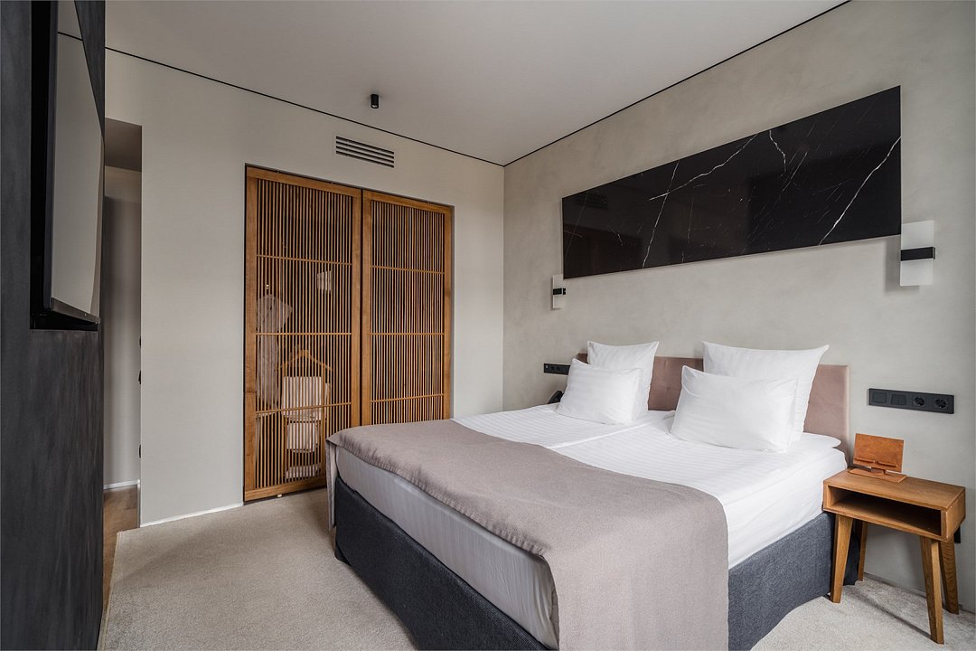 Уютный и стильный номер, идеальный для комфортного отдыха после насыщенного дня. В номере категории «Стандарт» есть все необходимое для приятного пребывания: двуспальная кровать, функциональная мебель, телевизор со смарт ТВ и собственная ванная комната, оборудованная душевой и туалетом. Это отличный выбор для тех, кто ценит соотношение цены и качества. Номера в рамках одной категории могут различаться по планировке и дизайну.Услуги и удобства