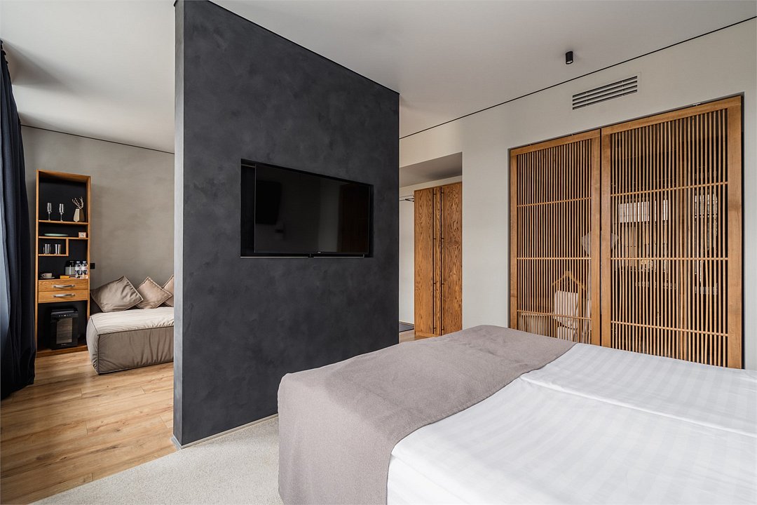 Погрузитесь в мир роскоши и комфорта в нашем номере категории "Люкс", где элегантный дизайн сочетается с передовыми технологиями и безупречным сервисом. Просторный номер с зонированием на спальню и гостиную предлагает максимальный комфорт и функциональность, создавая идеальное пространство для отдыха, работы и развлечений. Особая гордость номера – двусторонний телевизор, позволяющий наслаждаться просмотром любимых фильмов и передач как из гостиной, так и из спальни. Особенности: • Просторный номер с зонированием спальной и гостиной комнаты, оформленный в изысканном стиле. • Удобная кровать с ортопедическим матрасом и большой диван. • Просторная ванная комната с ванной и душевой кабиной. • Телевизор с плоским экраном со смарт-ТВ.Услуги и удобства