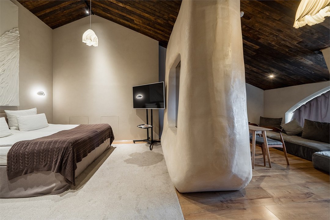 Окунитесь в атмосферу романтики и уюта в нашем эксклюзивном номере "Полулюкс-мансардный"! Расположенный на верхнем этаже отеля, этот номер отличается неповторимым шармом благодаря скошенным потолкам, окнам в крыше и просторному, свету наполненному пространству. Особенности: • Просторный номер, оформленный в уникальном мансардном стиле. • Телевизор со смарт-ТВ с широкой диагональю. • Обеденная зона (стол со стульями) .Услуги и удобства