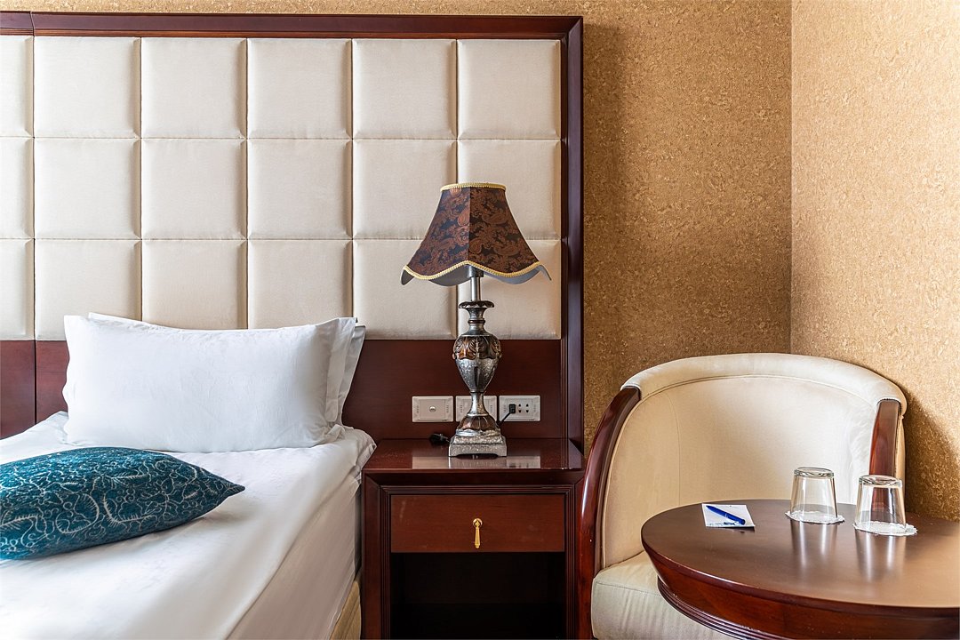 Одноместный стандарт — отличный выбор как для деловой поездки, так и для индивидуальных путешественников. Несмотря на компактную площадь 12 м², номер продуман до мелочей и обеспечивает уютное и комфортное пребывание. Интерьер выполнен в классическом стиле: светлые оттенки в оформлении, удобная мебель и современное оснащение создают атмосферу уюта и спокойствия. Здесь есть всё необходимое для комфортного отдыха после насыщенного дня. Для вашего удобства номер оборудован электронным замком, а современные стеклопакеты с шумоизоляцией обеспечивают тишину и приватность.Услуги и удобства