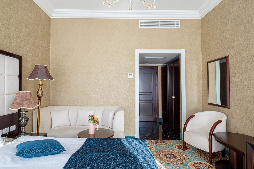 спутниковое телевидение, Wi-Fi, телефон, кондиционер, светильник, фен, электронные замки, ванная комната, гидромассажная ванна, теплый пол, халаты, банные полотенца, тапочки, гигиенические средства, косметические средства, двуспальная кровать, диван, тумбы, стулья, шкаф для одежды, вешалки, журнальный столик, письменный стол, зеркало, сейф, унитаз, раковина, косметическое зеркало, гостиная зона, ковровое покрытие, отопление, кресло, высокие потолки, стаканы, стул, туалетные средства, туалет, внутренний телефон, телевизор с плоским экраном, телевизор со Smart TV, номер для некурящих, мини-бар (платно), без питомцевВ гостиничном номере