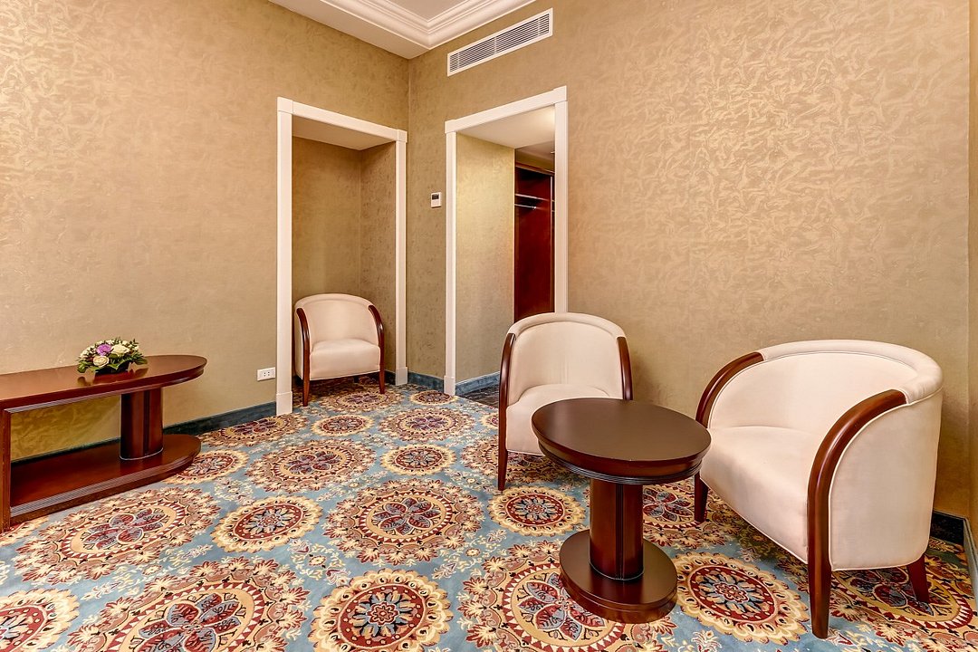 Элегантные номера категории "Делюкс с эркером" предполагают прекрасный вид на Невский проспект. Благодаря эркеру в комнату проникает больше естественного света, а пространство номера кажется ещё более просторным и уютным. В номерах предусмотрена комфортная зона отдыха с софой или креслами, где приятно провести время после насыщенного дня. При выборе размещения на дополнительном месте в номер устанавливается евро-раскладушка. Для удобства гостей во всех номерах предусмотрены чайные станции с набором пакетированного чая, а также мини-холодильники. Возможны варианты размещения: на одной двуспальной кровати размером 180×200 см или на двух раздельных кроватях 90×200 см.Услуги и удобства