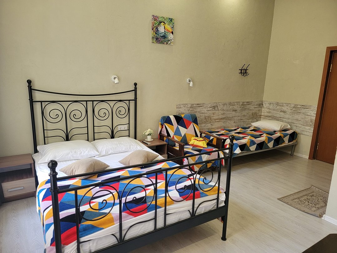 Номер с двуспальной и полуторной кроватью. Окно выходит в тихий двор.В номере