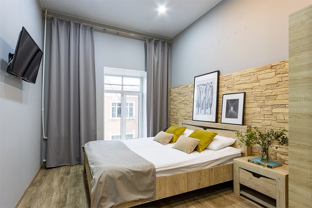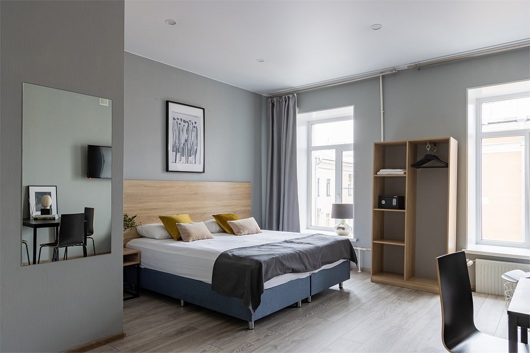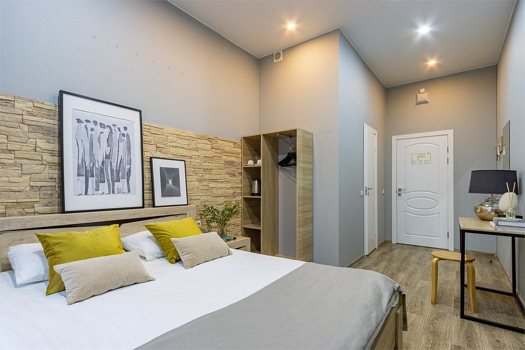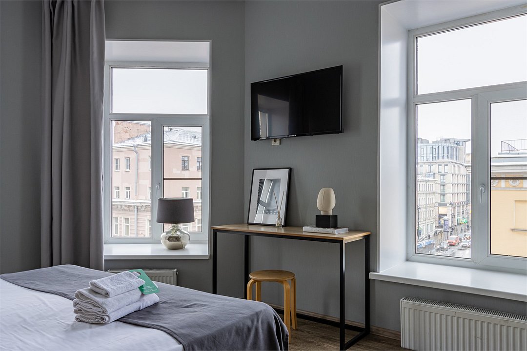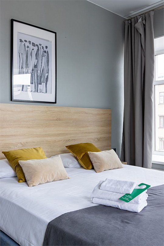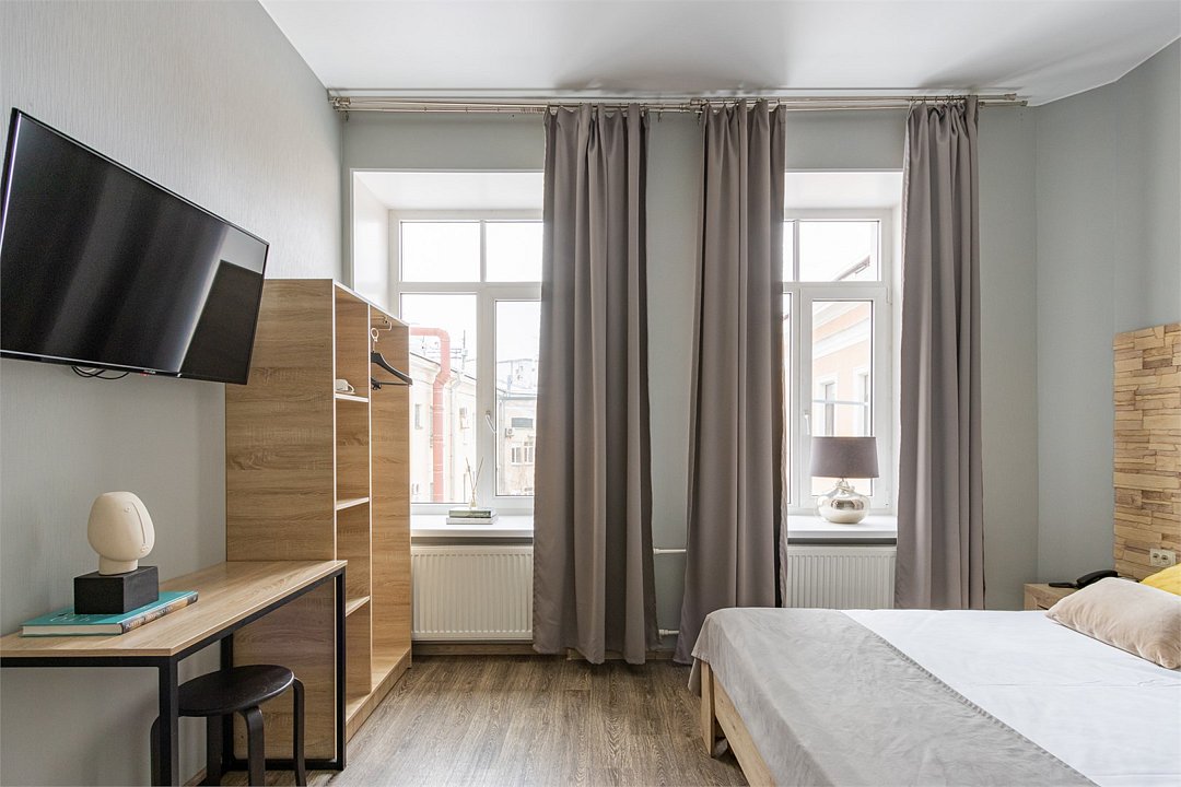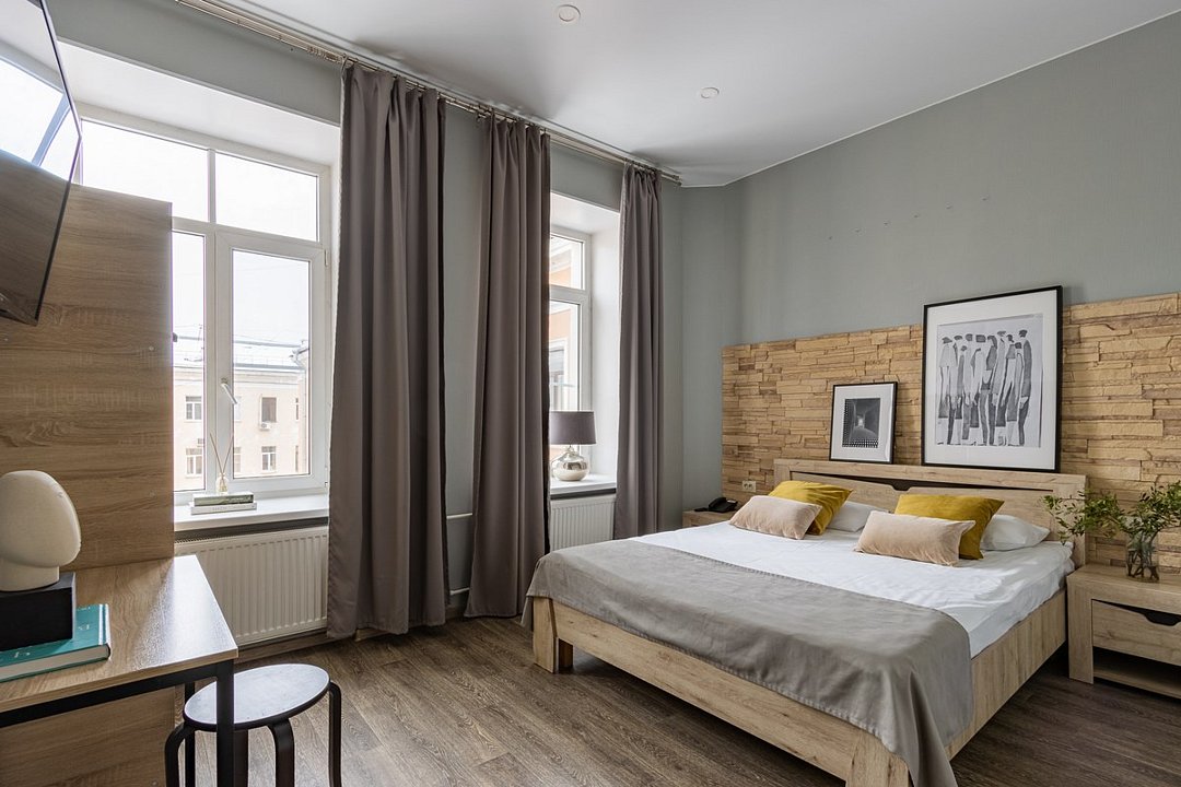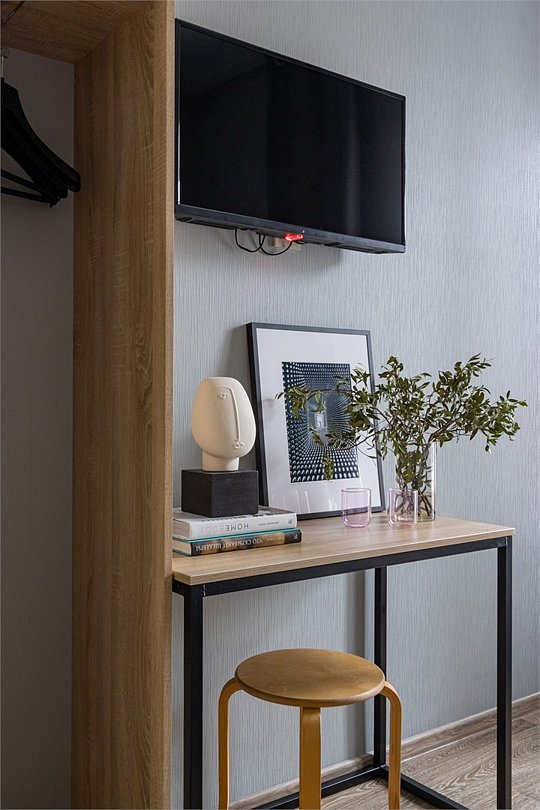 телевизор, кабельное телевидение, Wi-Fi, интернет, светильник, фен, душевая кабина, санузел, тапочки, косметические средства, двуспальная кровать, тумбы, шкаф для одежды, зеркало, чайник, унитаз, раковина, отопление, душ, вид на город, вид во двор, стаканы, стул, туалетные средства, туалет, внутренний телефон, телевизор с плоским экраном, москитная сетка, номер для некурящих, рабочий стол, уборка номера, вешалки-плечики, мыло, затемняющая штора, зеркало в полный рост, открытый шкаф, прачечная (за дополнительную плату)В номере