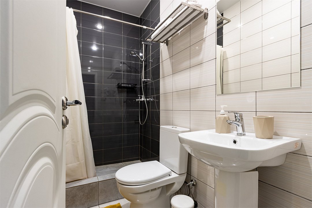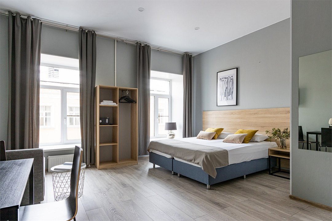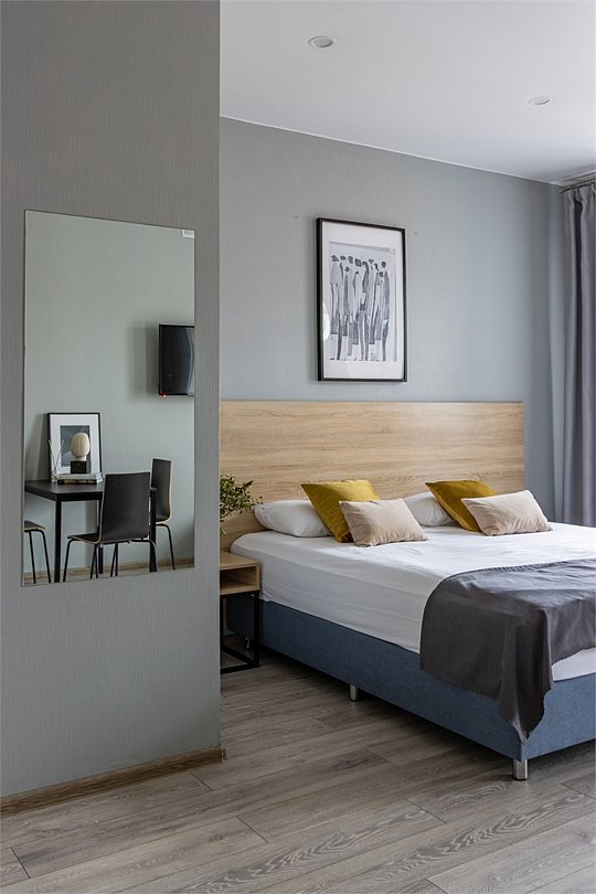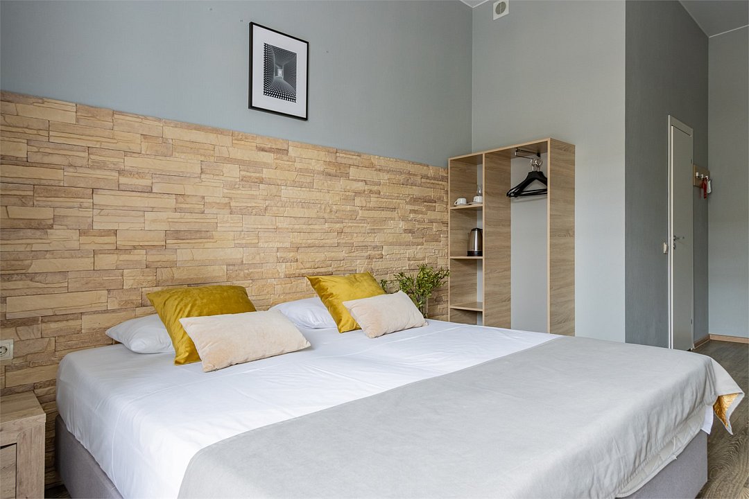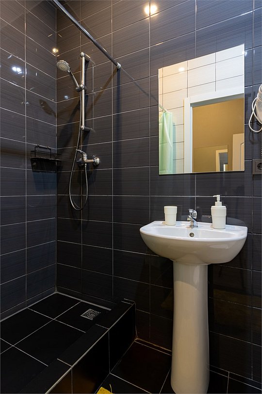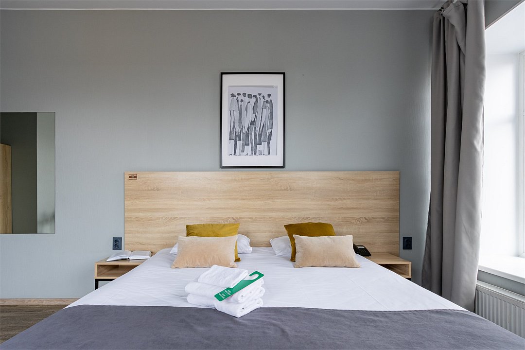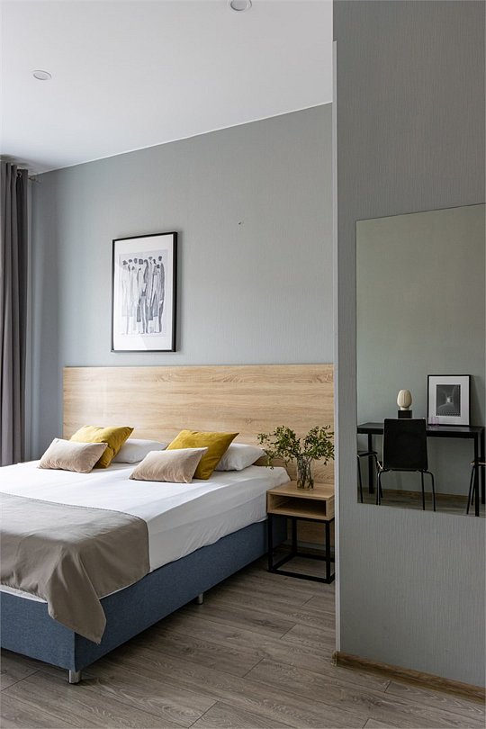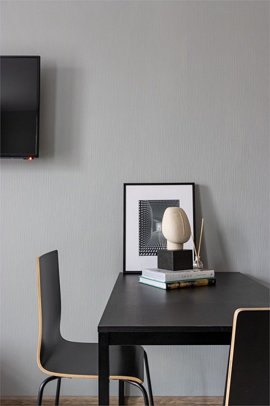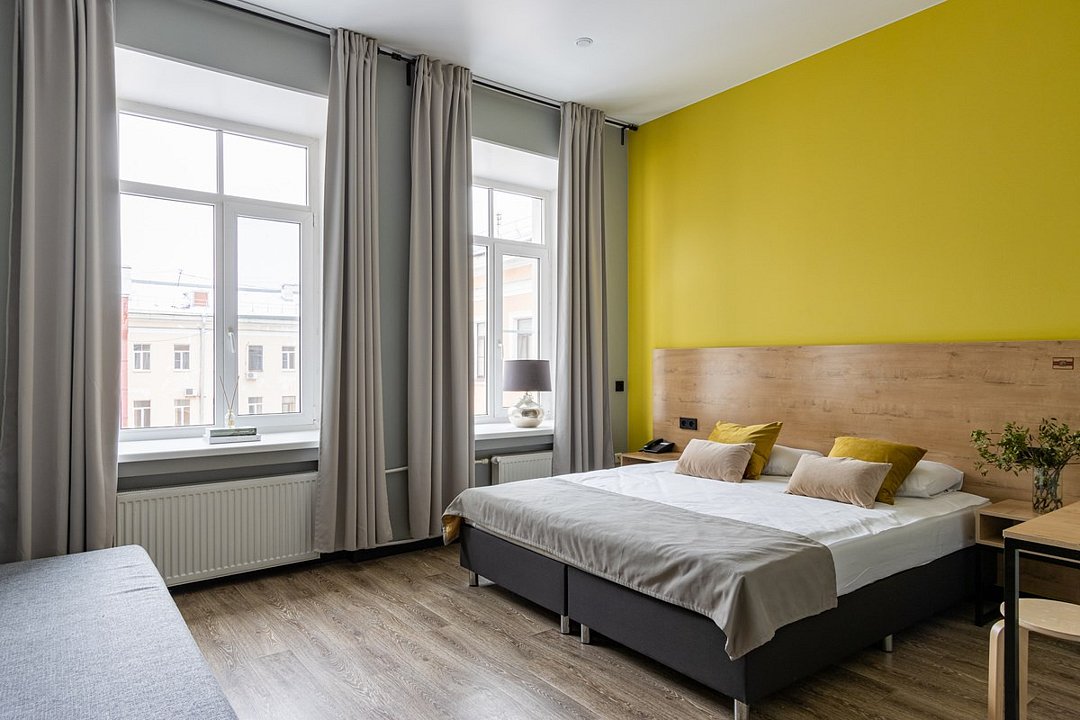 телевизор, кабельное телевидение, Wi-Fi, интернет, светильник, фен, душевая кабина, санузел, тапочки, косметические средства, двуспальная кровать, тумбы, шкаф для одежды, зеркало, чайник, унитаз, раковина, отопление, душ, вид на город, вид во двор, стаканы, стул, туалетные средства, туалет, внутренний телефон, телевизор с плоским экраном, москитная сетка, номер для некурящих, рабочий стол, уборка номера, вешалки-плечики, мыло, затемняющая штора, зеркало в полный рост, открытый шкаф, прачечная (за дополнительную плату)В номере
