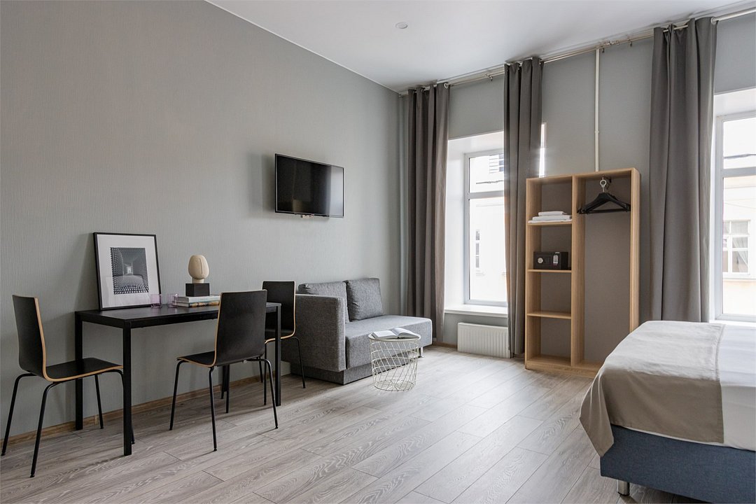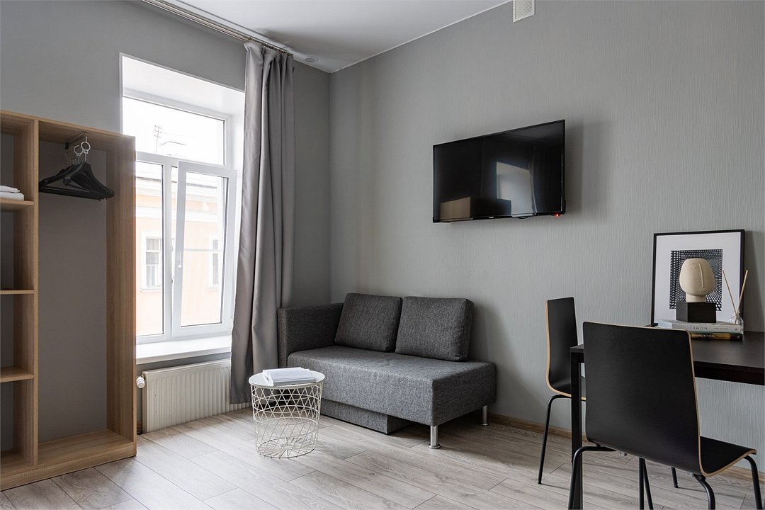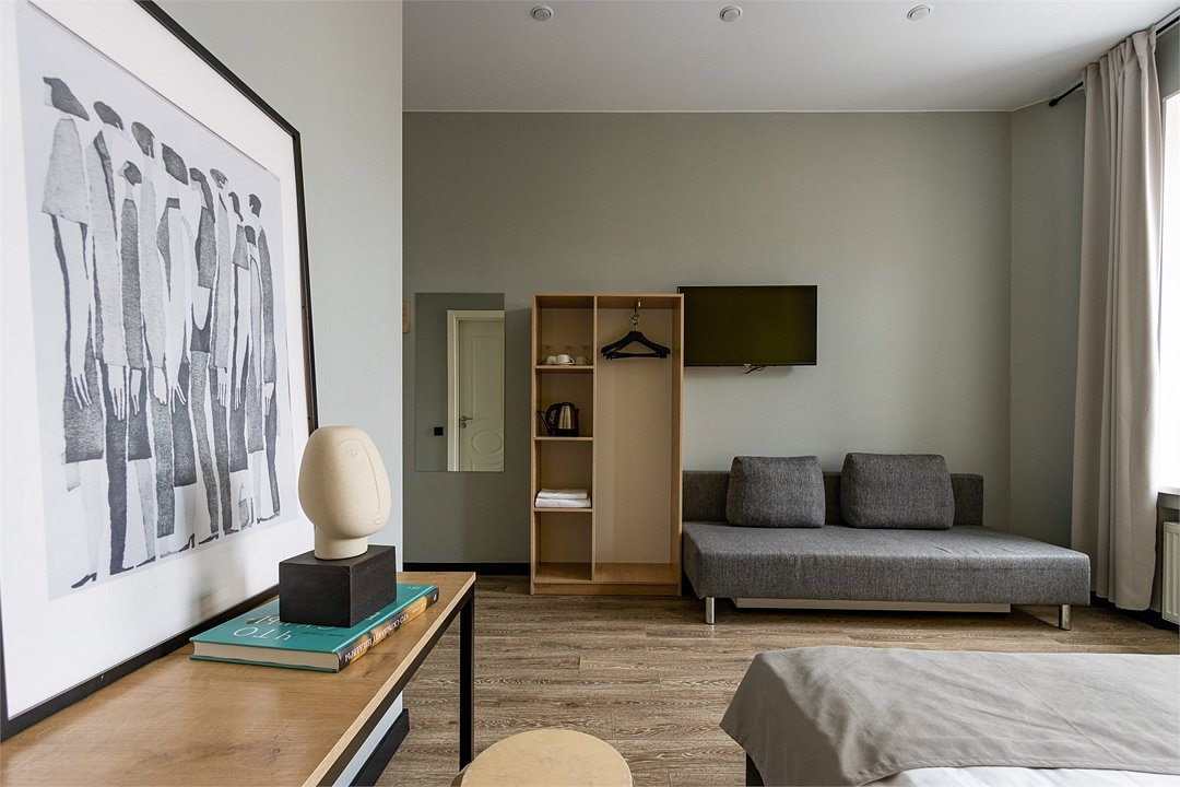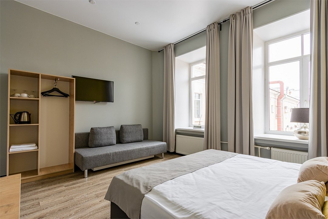 телевизор, кабельное телевидение, Wi-Fi, интернет, светильник, фен, душевая кабина, санузел, тапочки, косметические средства, двуспальная кровать, тумбы, шкаф для одежды, зеркало, чайник, унитаз, раковина, отопление, душ, вид на город, вид во двор, стаканы, стул, туалетные средства, туалет, диван-кровать, раскладной диван, внутренний телефон, телевизор с плоским экраном, москитная сетка, номер для некурящих, рабочий стол, уборка номера, вешалки-плечики, мыло, затемняющая штора, зеркало в полный рост, открытый шкафВ номере
