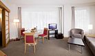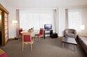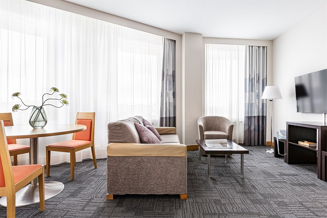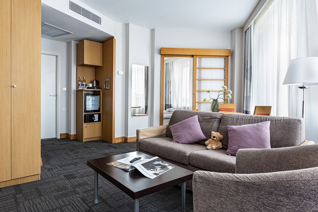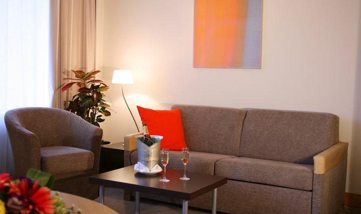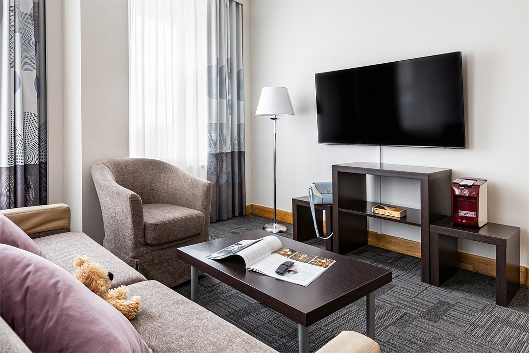 Просторный полулюкс, состоящий из гостиной и отдельной спальни с ванной комнатой, оснащен всеми необходимыми удобствами, включая два телевизора, халаты и тапки, VIP банную косметику, бесплатный интернет, чай/кофе.