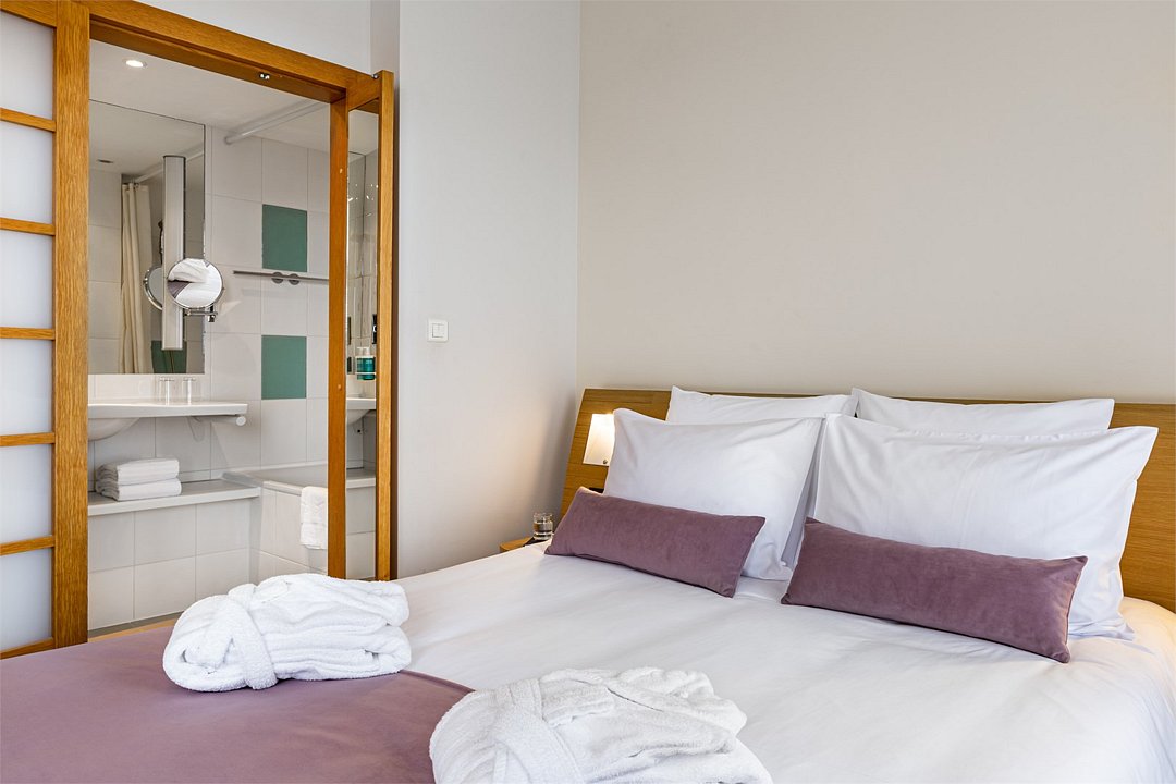 Интерьер номера выполнен в спокойных оттенках, с акцентом на уют и комфорт. Номер, расположенный в первом здании отеля, оснащён всем необходимым для вашего удобства. В номере предусмотрены принадлежности для приготовления чая и кофе, капсульная кофемашина, сейф, а также расширенный набор косметических средств. Гостям предоставляется бесплатный доступ к фитнес-центру и хаммаму с 06:00 до 23:00.Услуги и удобства