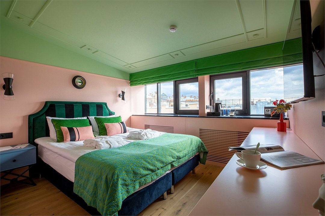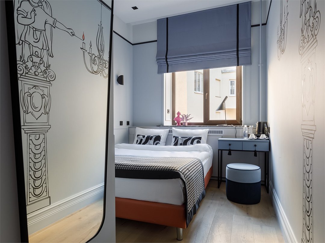 Современный, компактный номер для одного или двух гостей. Небольшой и очень уютный номер идеален для короткого знакомства с городом. Номера данной категории находятся на пятом мансардном этаже отеля с окошками в потолке. Номер оснащен кондиционером, сейфом, мини-холодильником, телефоном, телевизором с плоским экраном, чайной станцией. Все номера отеля имеют идеальную звукоизоляцию.Услуги и удобства