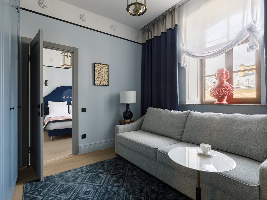 Двухкомнатный номер с двуспальной или двумя односпальными кроватями и раскладным диваном. Окна номера выходят на наб. реки Фонтанки и Летний сад. Номер оснащен кондиционером, сейфом, мини-баром, телефоном и телевизором с плоским экраном, чайной станцией. Все номера отеля имеют идеальную звукоизоляцию.Услуги и удобства