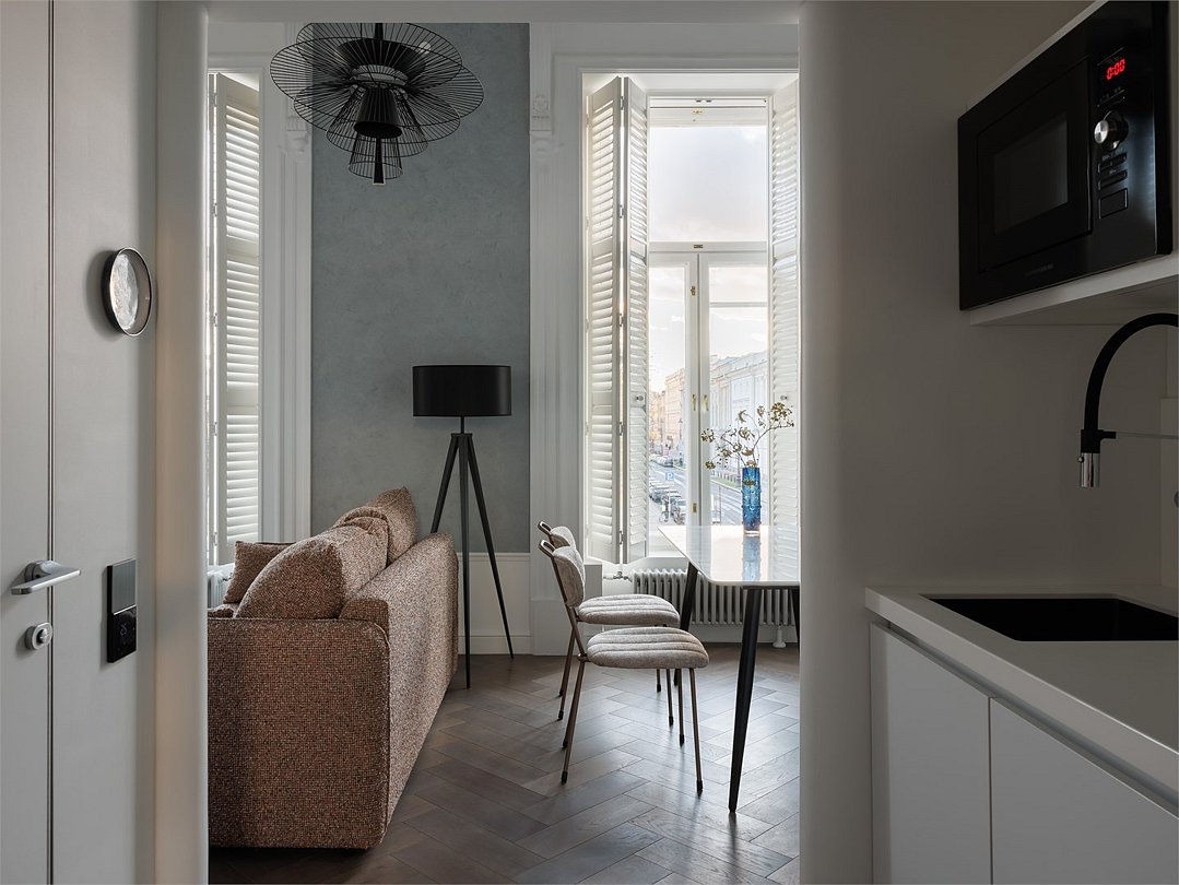 Уютный двухместный номер с большими светлыми окнами и высокими потолками. В номере большая двухспальная кровать и полноценная кухня. Особенности номера: - Вид на Невский проспект - Большие отреставрированные окна - Система «умный дом» - Премиальный текстиль - Ортопедический матрас - Высота потолков 5 метров - Полноценная кухня Размеры номеров могут варьироваться. Изображение строго не соответствует каждому номеру данной категории.Услуги и удобства
