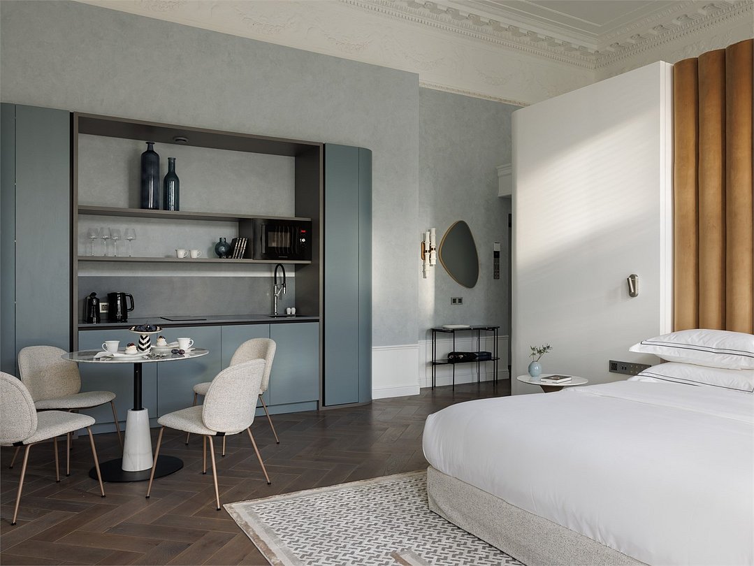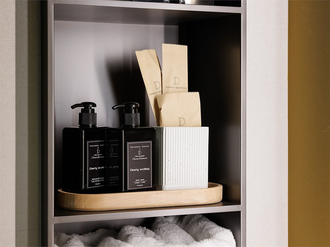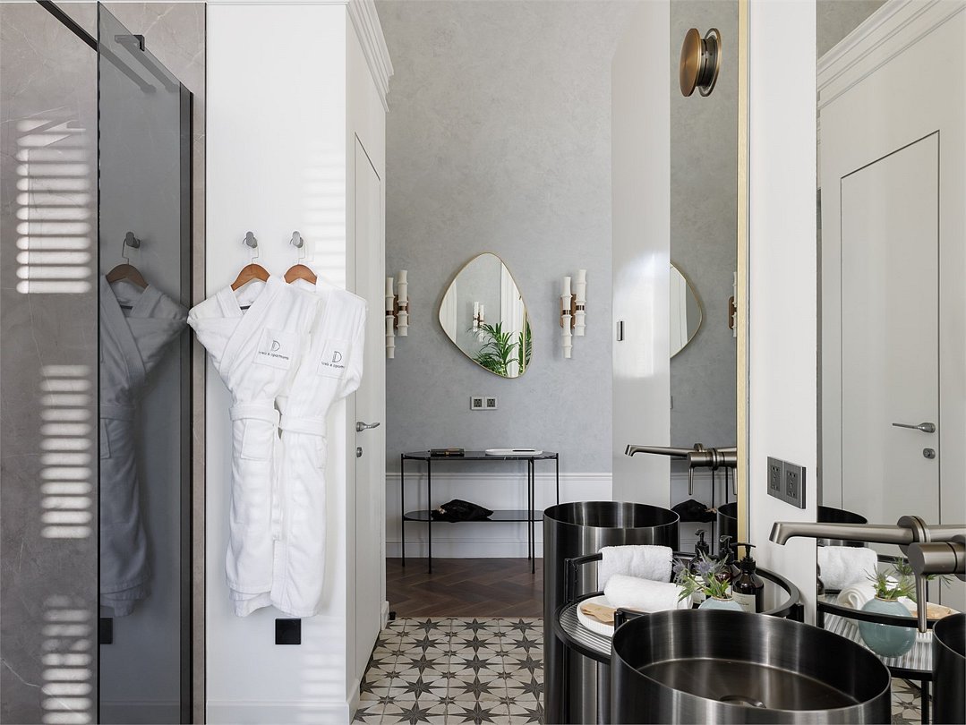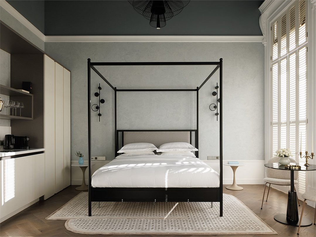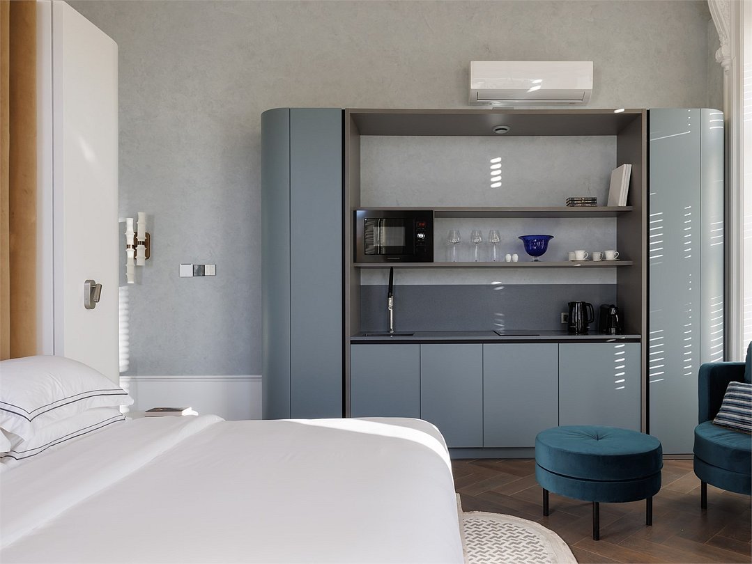 Wi-Fi, кондиционер, фен, электронные замки, халаты, тапочки, косметические средства, кровать «Queen size», тумбы, эксклюзивная мебель, чайный набор, обслуживание номеров, сейф, чайник, душ, вид во двор, внутренний телефон, телевизор со Smart TV, система умный дом, услуги прачечной (платно), туалетные принадлежности премиум-класса, бутилированная вода, затемняющая штора, косметические принадлежности премиум-класса, сенсорные панели для управление освещениемВ номере