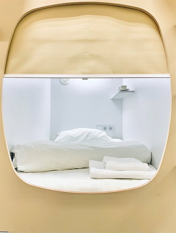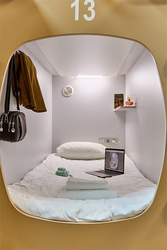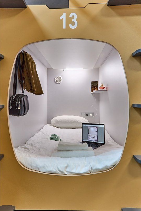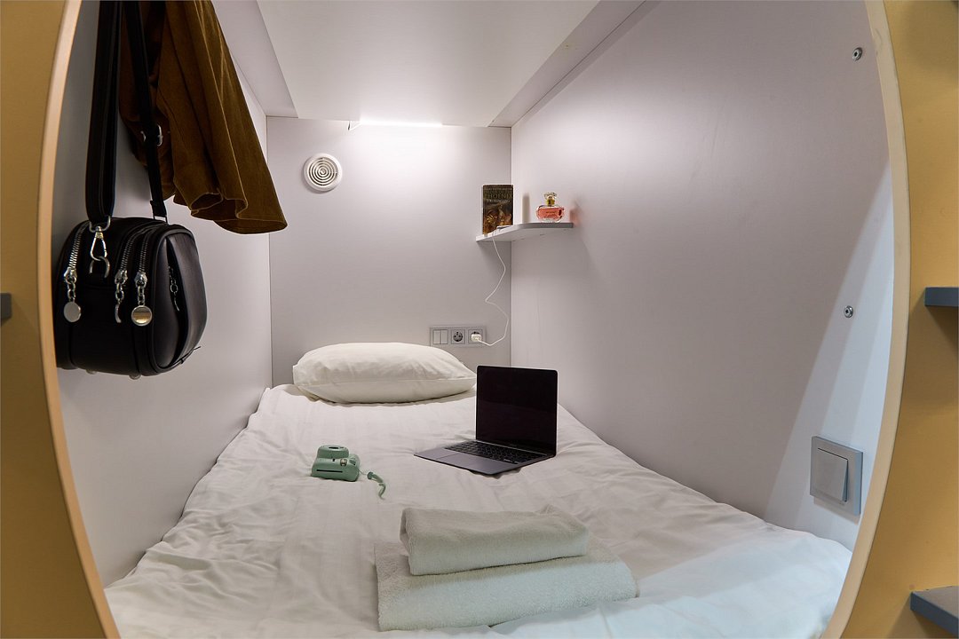 Уютная одноместная капсула расположена на нижнем ярусе снабжена ортопедическим матрасом, комплектом качественного постельного белья и полотенец, светодиодной подсветкой и системой вентиляции. Каждая капсула оборудована электрическими розетками, полочкой для мелочей, вешалкой для одежды, индивидуальным ящиком для чемодана и лотком для обуви. В общих ванных комнатах с туалетом и душевыми предоставляются средства личной гигиены. Выход из капсулы закрывается плотной шторкой. Площадь одноместной капсулы 95х1,25х2 м.Услуги и удобства