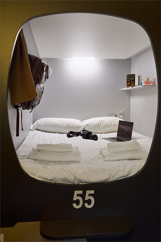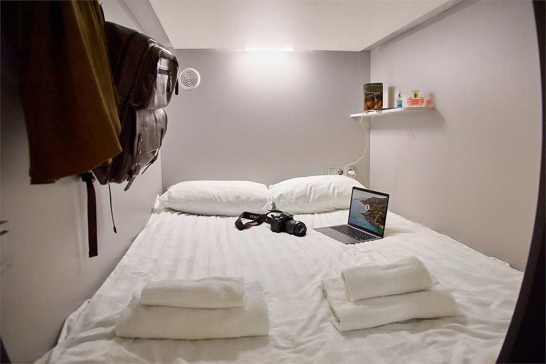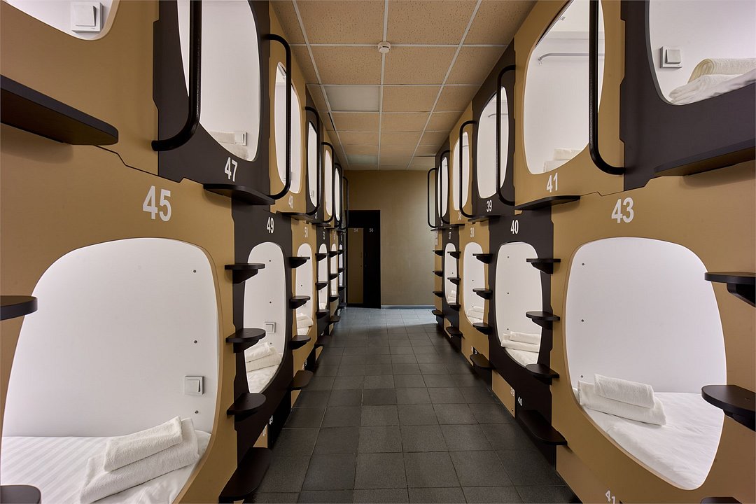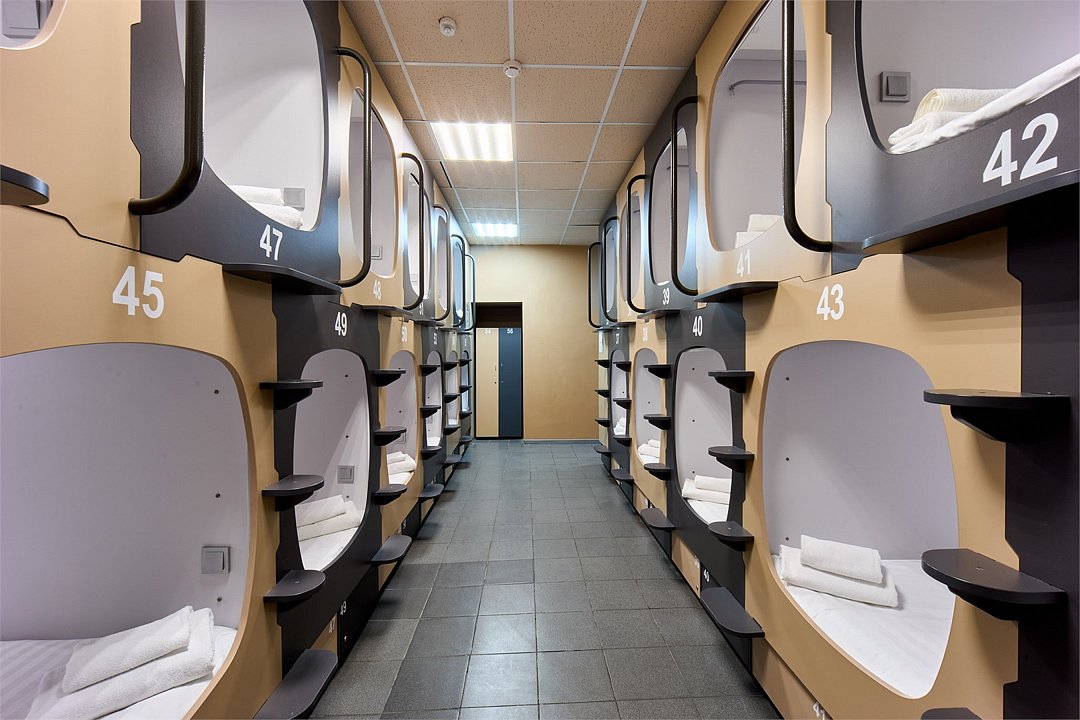 Улучшенная просторная капсула подойдет как для одноместного, так и для двухместного размещения. Капсула снабжена ортопедическим матрасом, комплектом качественного постельного белья и полотенец, светодиодной подсветкой и системой вентиляции. Каждая капсула оборудована электрическими розетками, полочкой для мелочей, вешалкой для одежды, индивидуальным ящиком для чемодана и лотком для обуви. В общих ванных комнатах с туалетом и душевыми предоставляются средства личной гигиены. Выход из капсулы закрывается плотной шторкой. Площадь улучшенной капсулы 1,45х1,24х2 м.Услуги и удобства