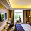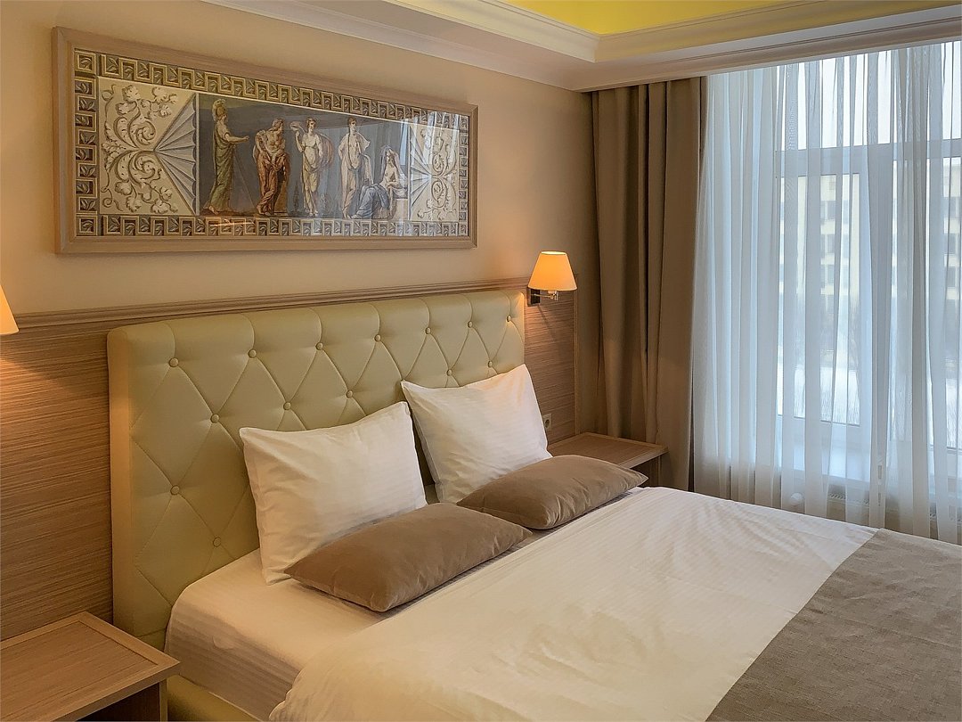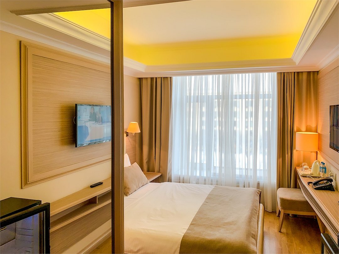спутниковое телевидение, Wi-Fi, телефон, система климат-контроля, светильник, настольные лампы, электронные замки, ванная комната, душевая кабина, банные полотенца, косметические средства, двуспальная кровать, шкаф для одежды, вешалки, багажная тумба, зеркало, звуконепроницаемые стены и окна, чайный набор, набор посуды, сейф, чайник, унитаз, раковина, питьевая вода, отопление, вид на город, вид во двор, внутренний телефон, телевизор с плоским экраном, мини-холодильник, номер для некурящих, пуфикВ номере