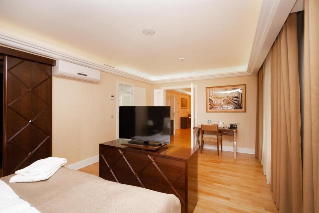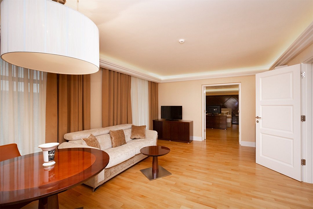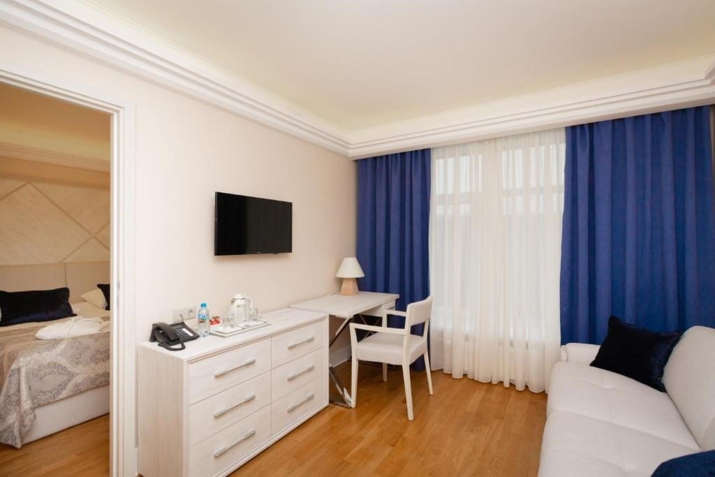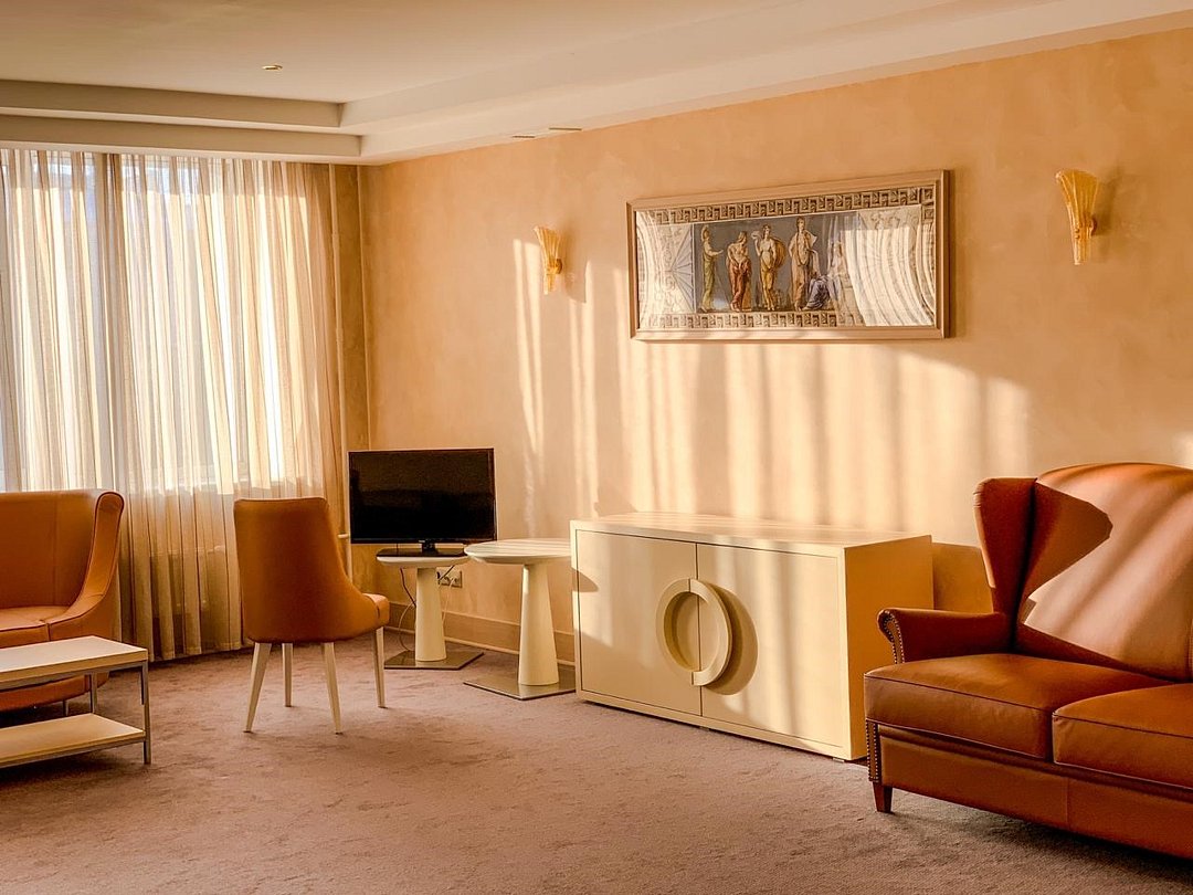 два телевизора, спутниковое телевидение, Wi-Fi, телефон, система климат-контроля, настольные лампы, фен, электронные замки, ванная комната, душевая кабина, санузел, дополнительный санузел, биде, халаты, банные полотенца, тапочки, косметические средства, кровать «King size», диван, кресла, тумбы, стулья, шкаф для одежды, гардеробная, вешалки, журнальный столик, письменный стол, стол для переговоров, обеденный стол, багажная тумба, зеркало, комод, эксклюзивная мебель, мебельный гарнитур, письменные принадлежности, чайный набор, обслуживание номеров, сейф, чайник, раковина, мягкая мебель, косметическое зеркало, питьевая вода, обеденная зона, отопление, вид на город, три комнаты, кабинет, кресло, вид во двор, диван-кровать, раскладной диван, внутренний телефон, телевизор с плоским экраном, мини-холодильник, номер для некурящихВ номере