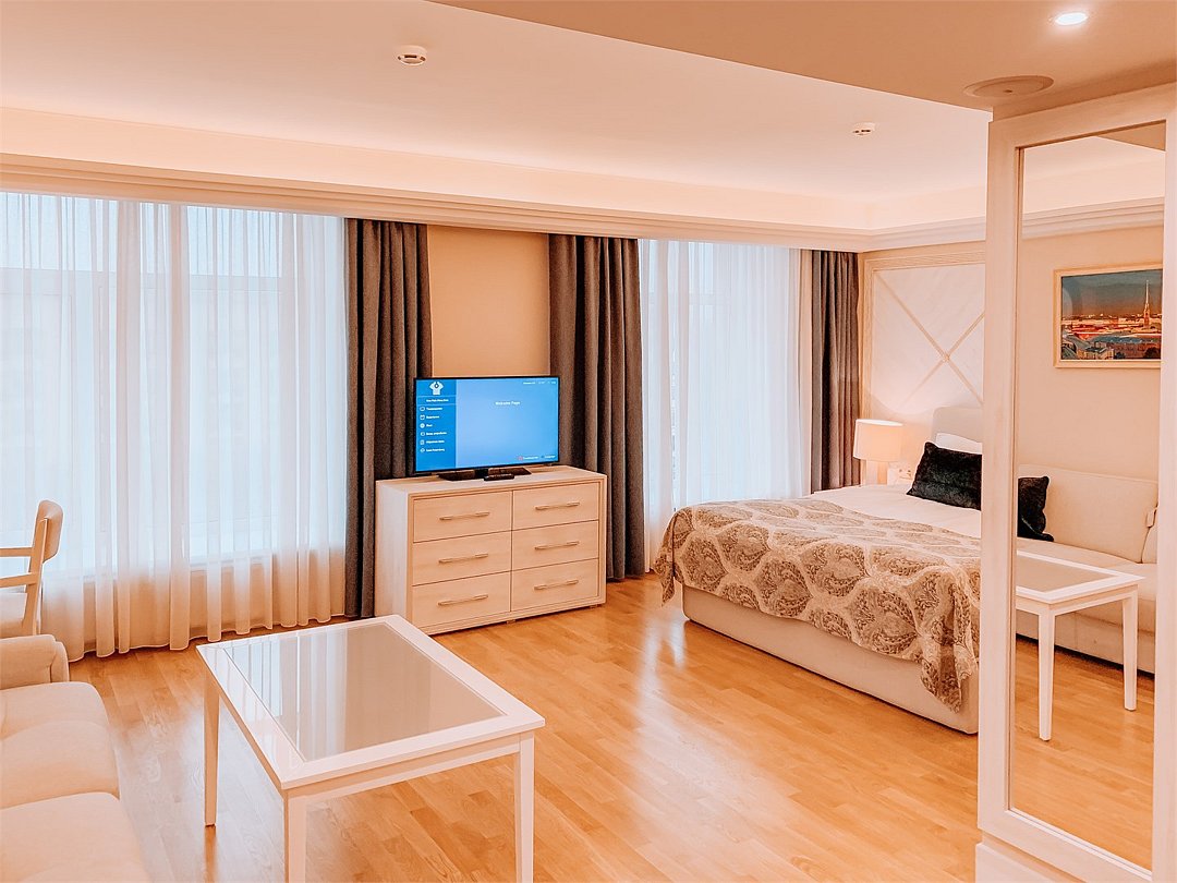 спутниковое телевидение, Wi-Fi, телефон, система климат-контроля, светильник, настольные лампы, фен, электронные замки, ванная комната, душевая кабина, халаты, тапочки, косметические средства, кровать «King size», тумбы, стулья, шкаф для одежды, вешалки, багажная тумба, зеркало, две комнаты, чайный набор, сейф, чайник, унитаз, раковина, питьевая вода, отопление, вид на город, вид во двор, стол, диван-кровать, раскладной диван, внутренний телефон, телевизор с плоским экраном, мини-холодильник, номер для некурящихВ номере