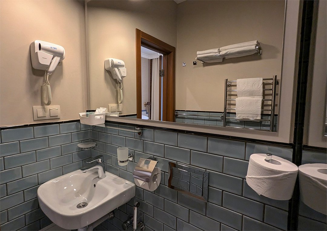 Wi-Fi, телефон, кондиционер, светильник, фен, душевая кабина, санузел, халаты, банные полотенца, тапочки, косметические средства, две односпальные или большая двуспальная кровать, тумбы, стулья, шкаф для одежды, письменный стол, багажная тумба, зеркало, чайный набор, сейф, раковина, душ, вид на город, кулер на этаже, кресло, вид во двор, внутренний телефон, телевизор с плоским экраном, мини-холодильник, гостиничная парфюмерия, номер для некурящихВ номере