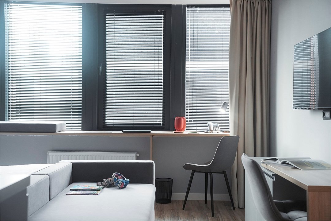телевизор, интерактивное телевидение, Wi-Fi, телефон, светильник, настольные лампы, фен, система безопасности, электронные замки, плита для приготовления пищи, кофемашина, микроволновая печь, утюг, ванная комната, халаты, банные полотенца, тапочки, кровать «Queen size», две односпальные кровати, раковина, душ, вид на город, кулер на этаже, туалетные средства, туалет, сплит-система, мини-холодильник, шапочка для душа, мыло, можно с питомцамиВ номере