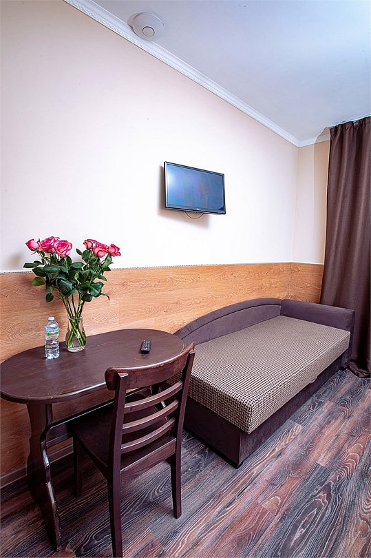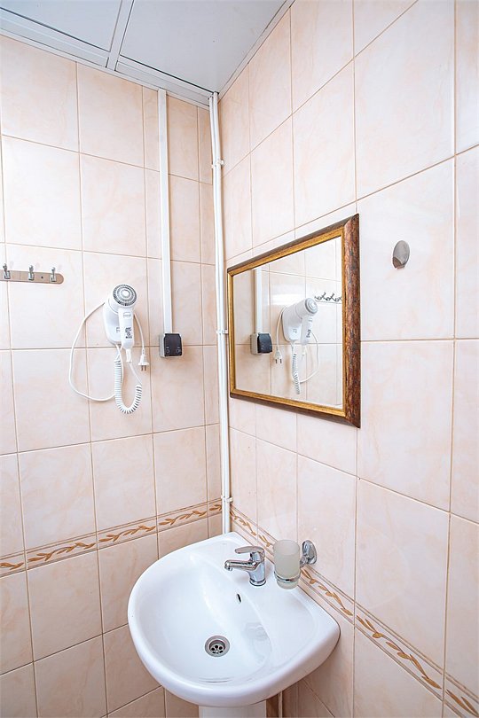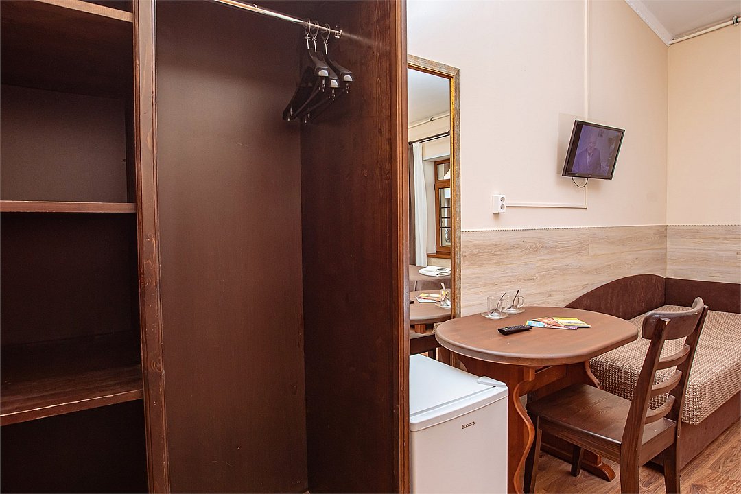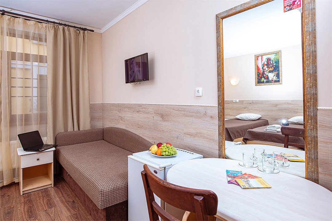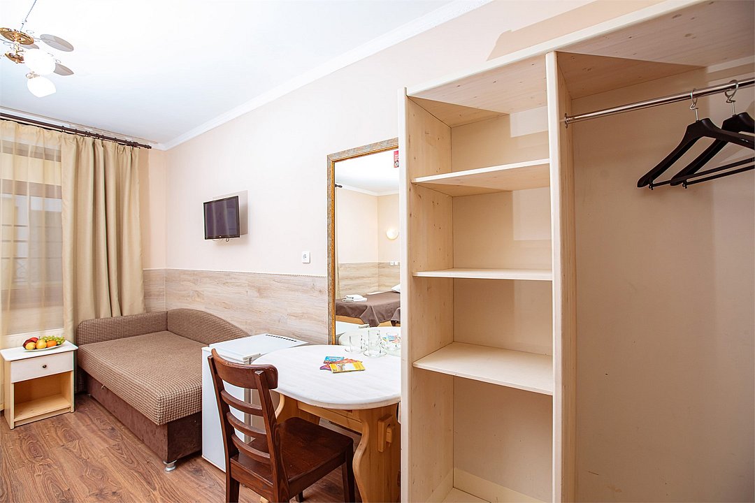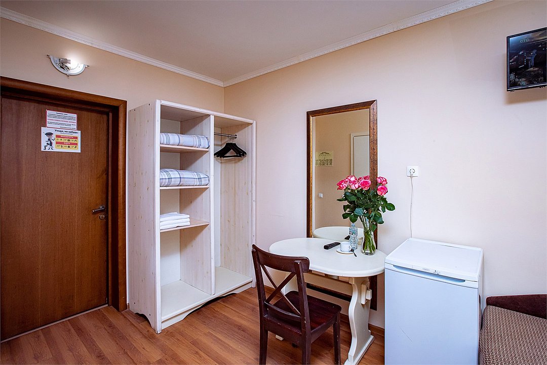 Ваш уютный номер для 1-3 гостей Откройте для себя комфорт и функциональность наших номеров, созданных для вашего идеального отдыха. Простор для двоих: Двухместный номер площадью 18 м² оснащен двумя раздельными кроватями и удобным односпальным диваном. Компактное решение: Одноместный номер предлагает уютное пространство от 10 до 12 м². Спокойствие и тишина: Все номера имеют вид на живописный внутренний дворик отеля. В каждом номере вас ждет: Центральное отопление для поддержания комфортной температуры. Шкаф или гардероб с вешалками для ваших вещей. Зеркало, телевизор с плоским экраном для досуга. Холодильник для напитков и закусок. Рабочий стол со стулом. Ваша личная ванная комната включает: Душ и туалет. Фен для укладки волос. Мягкие полотенца. Дополнительные преимущества: Всегда доступна свежая питьевая вода (горячая и холодная) из кулера в здании. Для дополнительного комфорта можно забронировать уютный диванчик. Путешествуете с малышом? Детская кроватка (до 3 лет) предоставляется бесплатно по предварительному запросуУслуги и удобства