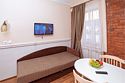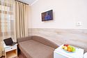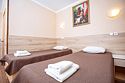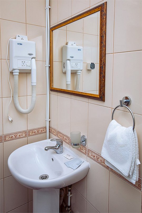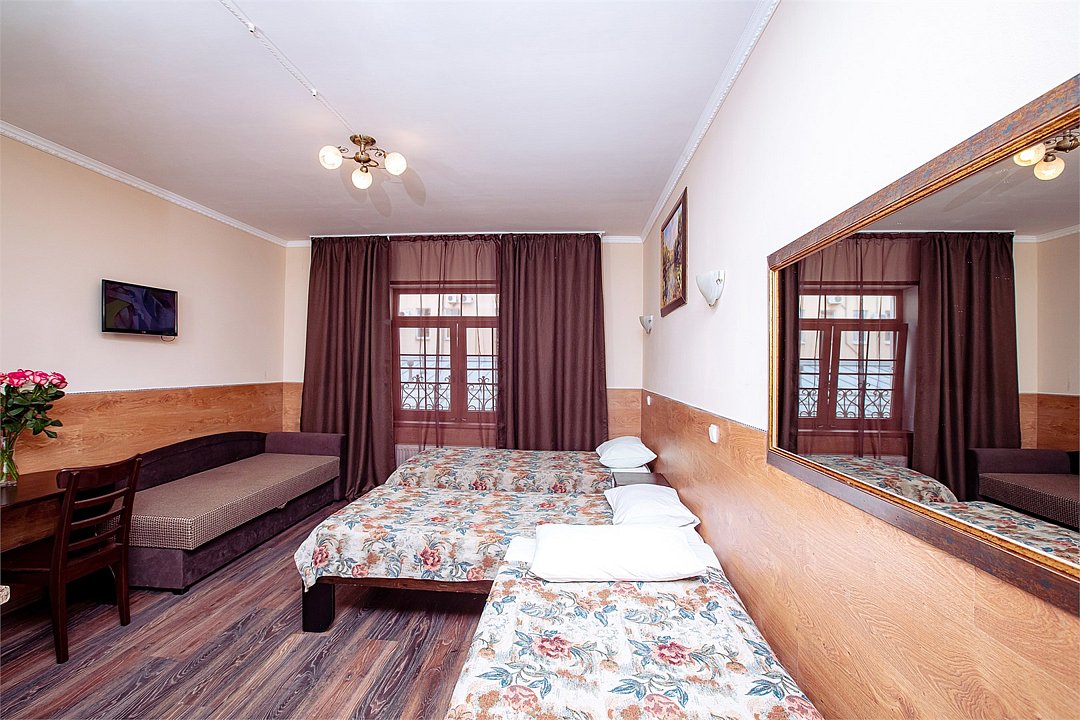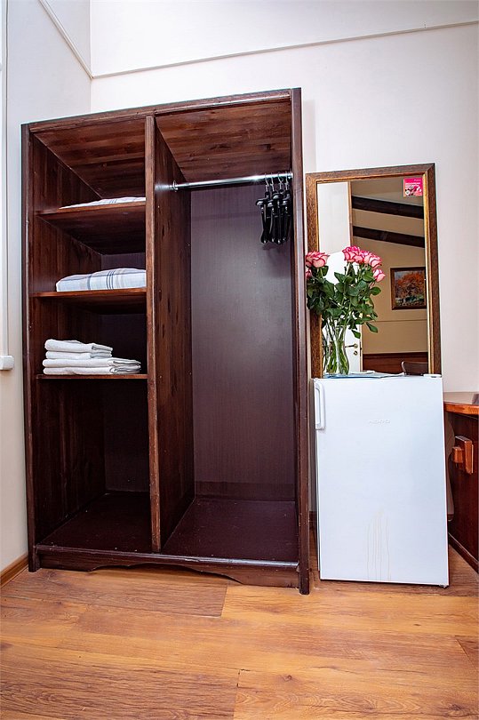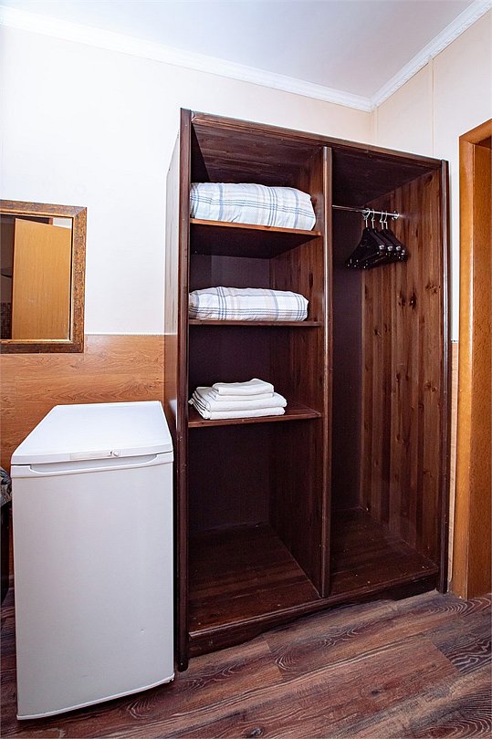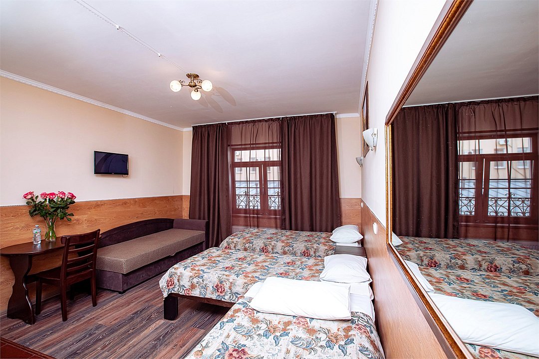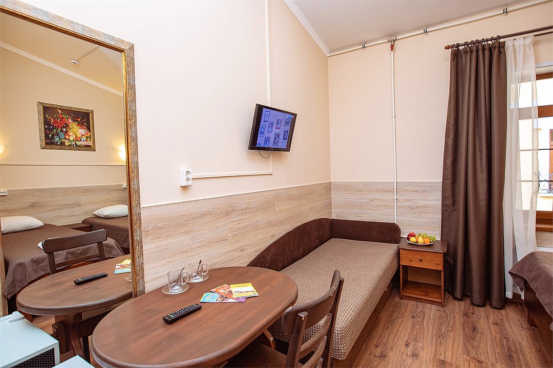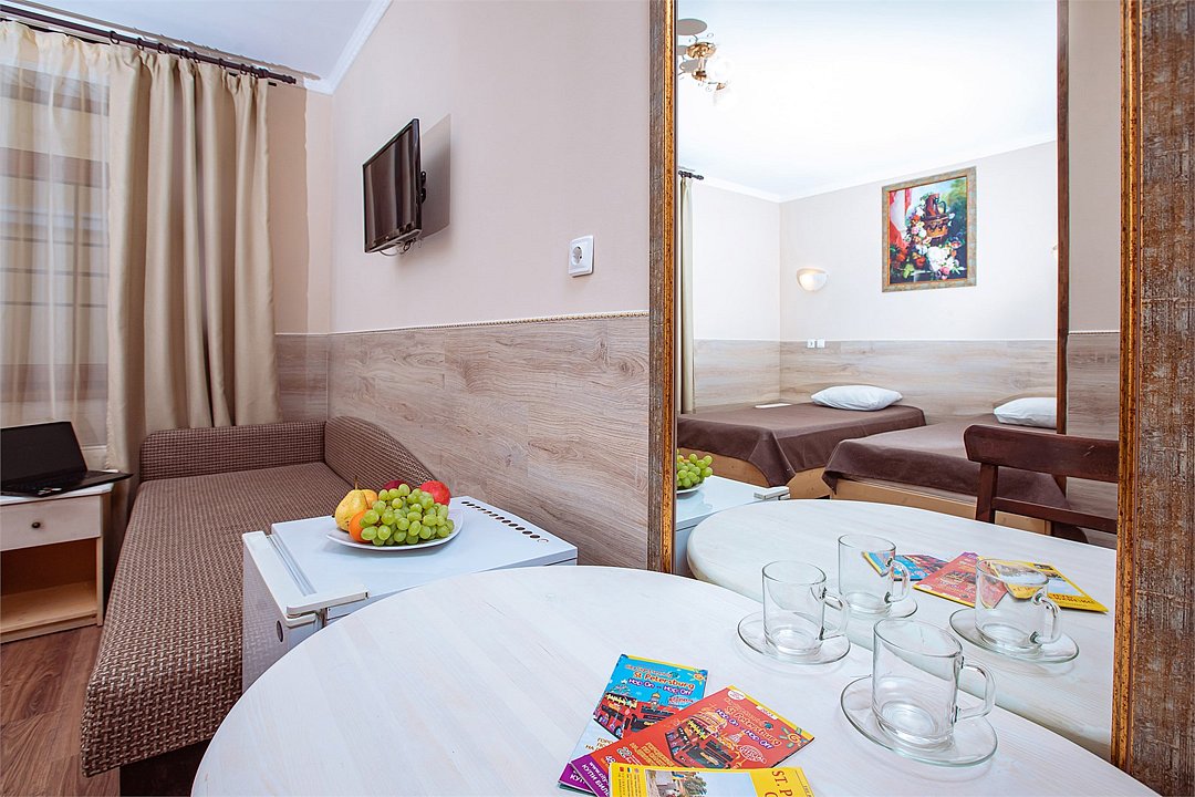 Ваш уютный номер для 1-3 гостей Откройте для себя комфорт и функциональность наших номеров, созданных для вашего идеального отдыха. Простор для двоих: Двухместный номер площадью 18 м² оснащен двумя раздельными кроватями и удобным односпальным диваном. Компактное решение: Одноместный номер предлагает уютное пространство от 10 до 12 м². Спокойствие и тишина: Все номера имеют вид на живописный внутренний дворик отеля. В каждом номере вас ждет: Центральное отопление для поддержания комфортной температуры. Шкаф или гардероб с вешалками для ваших вещей. Зеркало, телевизор с плоским экраном для досуга. Холодильник для напитков и закусок. Рабочий стол со стулом. Ваша личная ванная комната включает: Душ и туалет. Фен для укладки волос. Мягкие полотенца. Дополнительные преимущества: Всегда доступна свежая питьевая вода (горячая и холодная) из кулера в здании. Для дополнительного комфорта можно забронировать уютный диванчик. Путешествуете с малышом? Детская кроватка (до 3 лет) предоставляется бесплатно по предварительному запросуУслуги и удобства