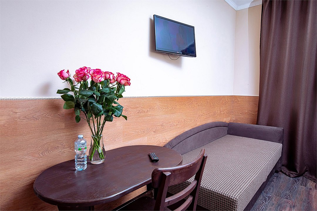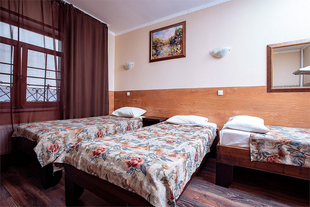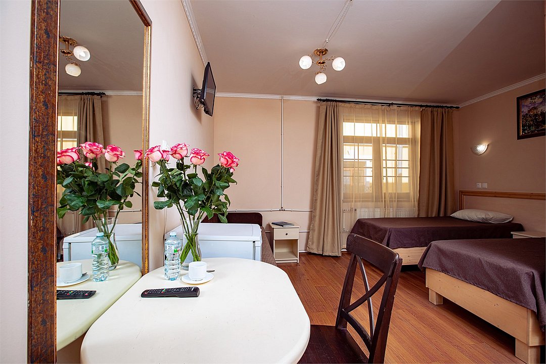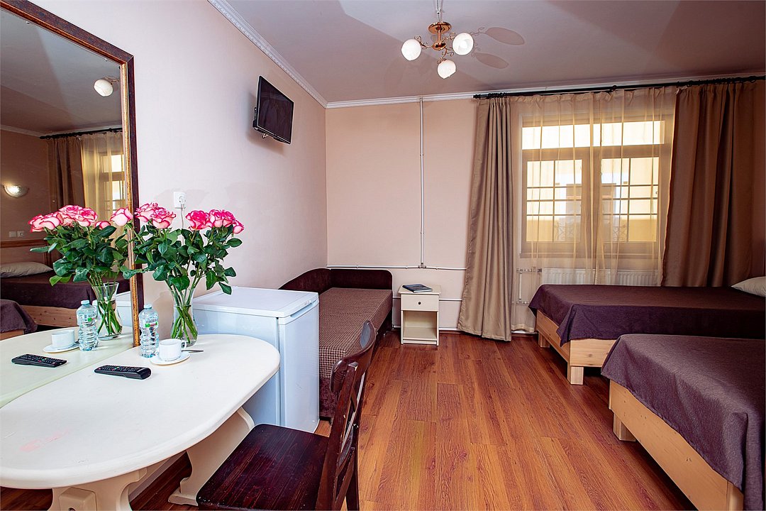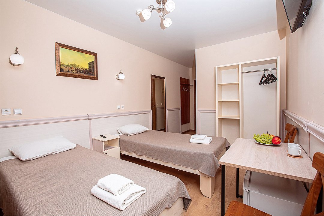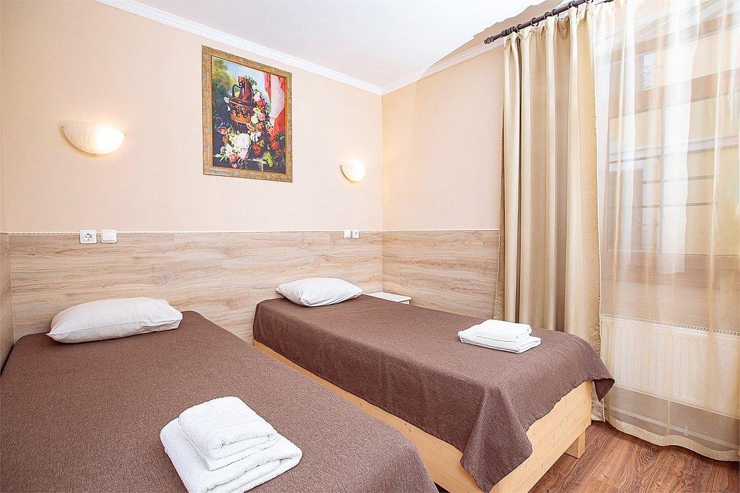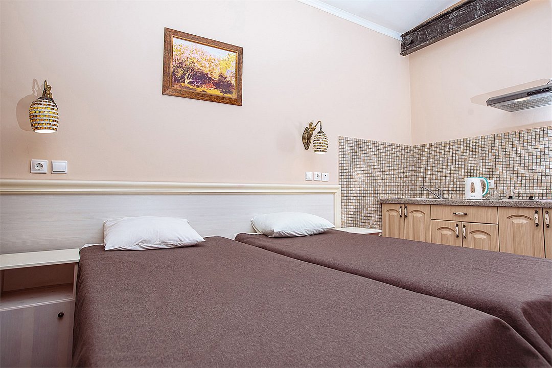 Однокомнатный номер с удобствами. Две односпальные кровати. Телевизор, холодильник, фен. Душевая кабина.Wi-fi в номере. Место на третьего чел.: кровать/диван/еврораскладушка