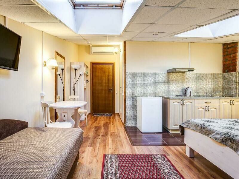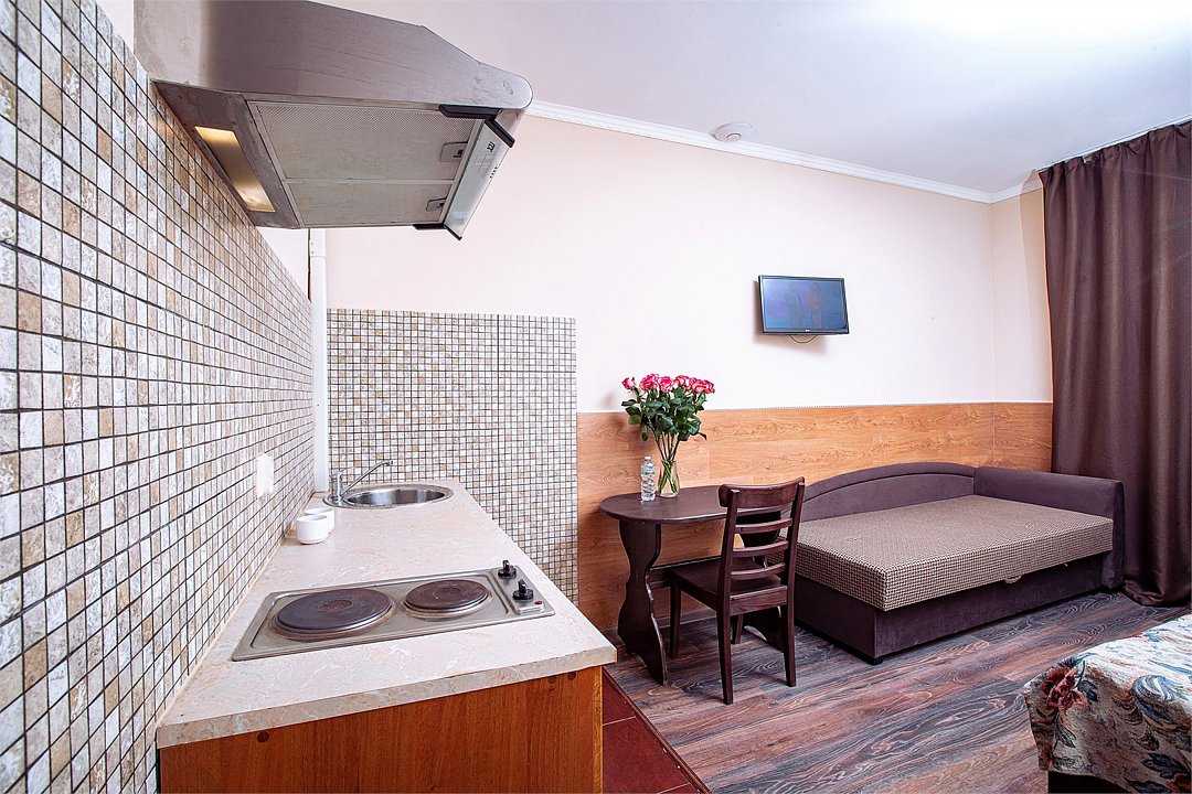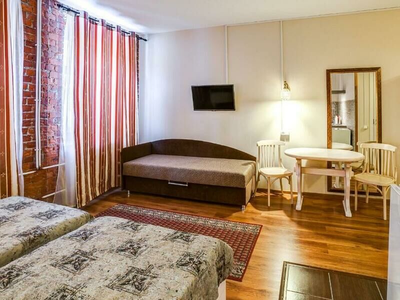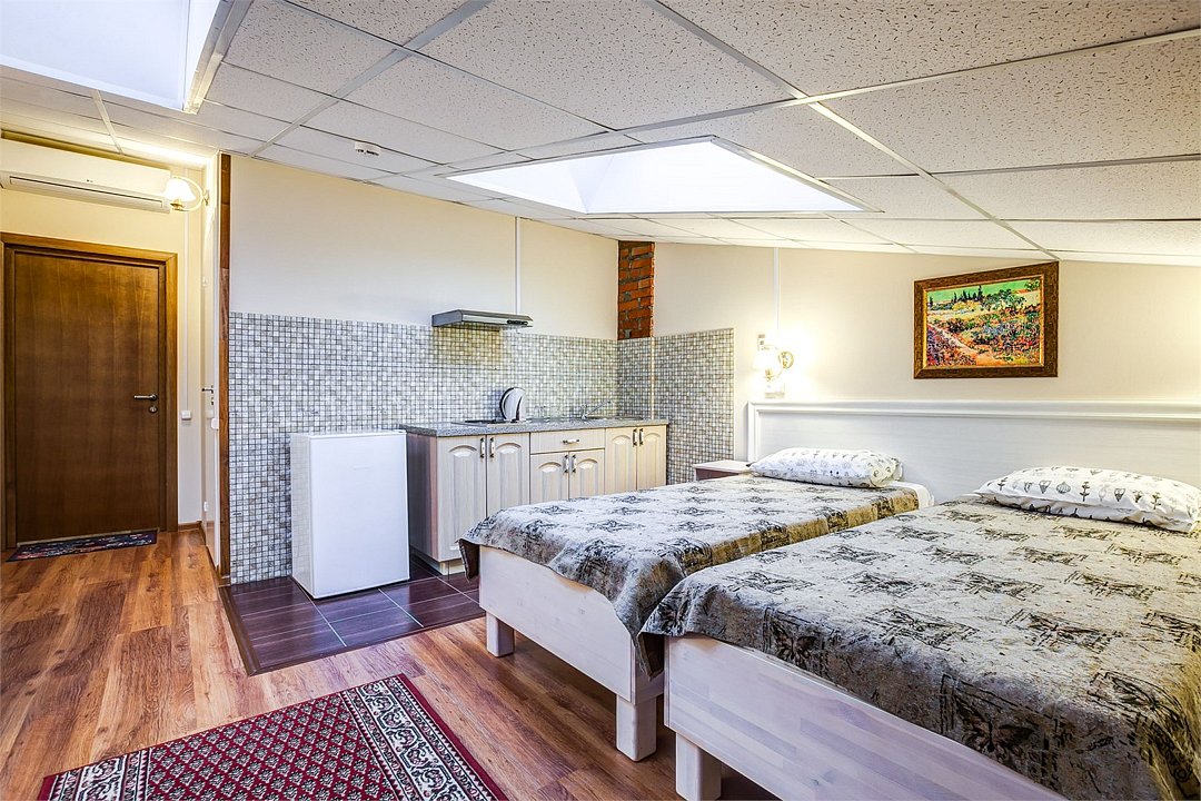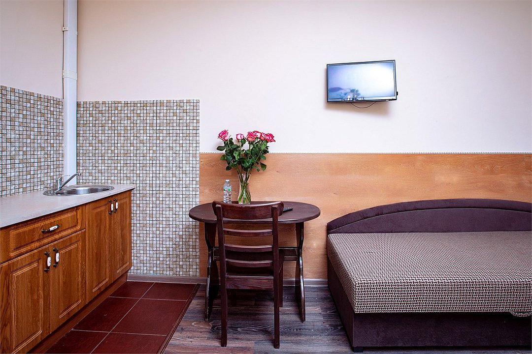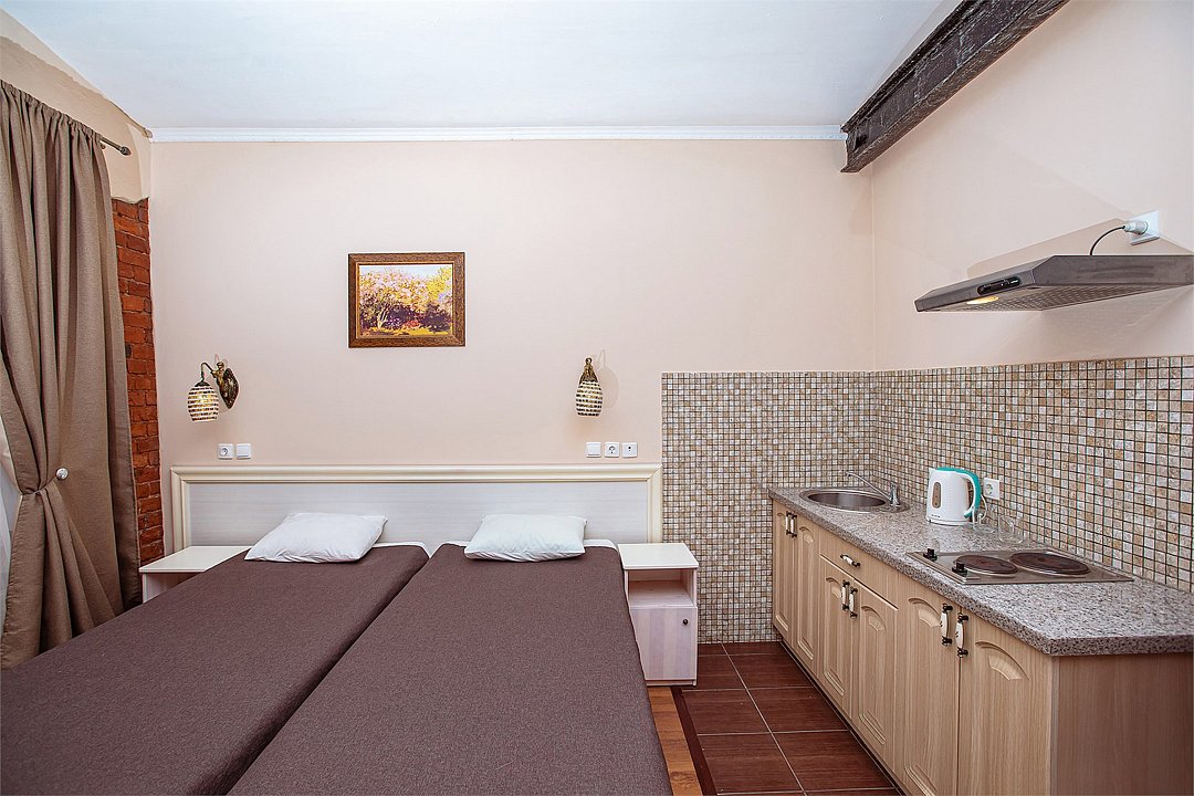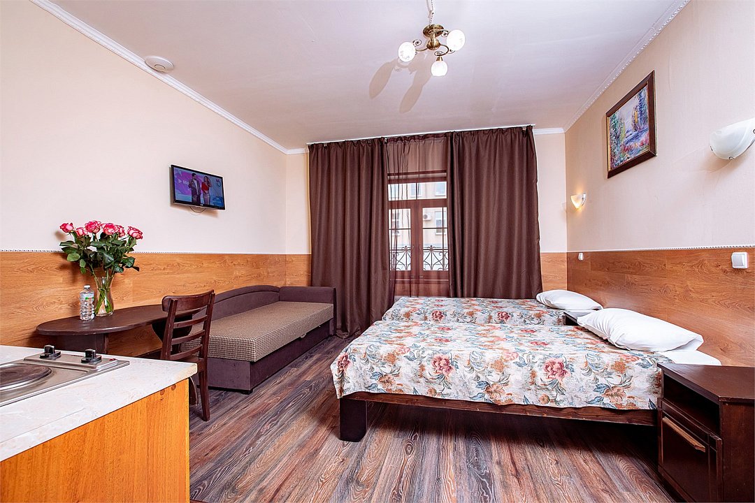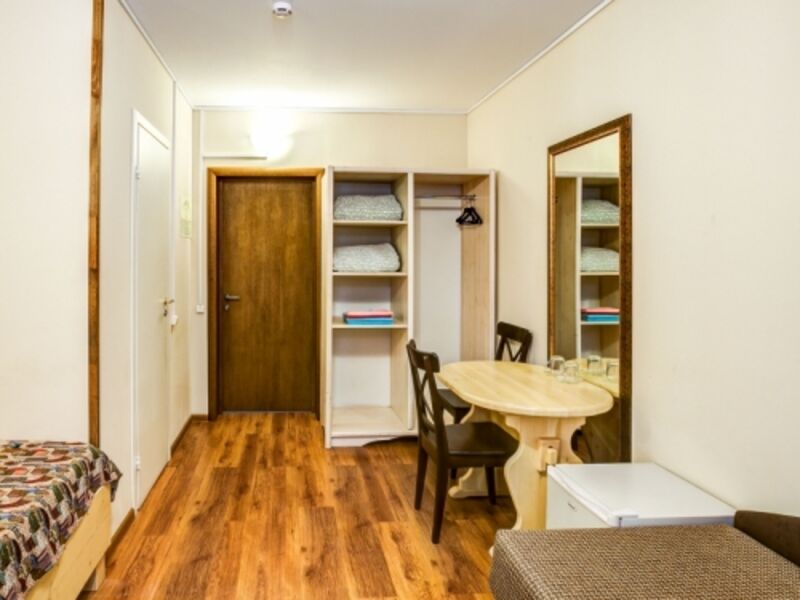Ищете недорогой и комфортный вариант для проживания в Санкт-Петербурге? Наши номера-студии идеально подойдут для 1-4 гостей, особенно если вы планируете длительное пребывание или путешествуете с детьми. Площадь номера варьируется от 23 до 25 м². В каждом номере вас ждет функциональная кухонная зона и уютный вид во внутренний дворик. В номере: Кухонная зона с плитой и вытяжкой 2 или 3 раздельные кровати Диван-тахта (в большинстве номеров) Телевизор с плоским экраном Холодильник Обеденный стол и стулья Шкаф или гардероб с вешалками Центральное отопление Зеркало Собственная ванная комната с душем и туалетом Фен Полотенца В корпусе - кулер с горячей и холодной водой, микроволновая печьУслуги и удобства