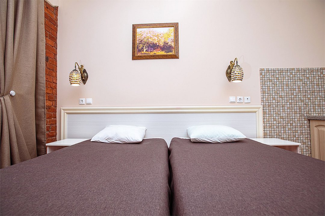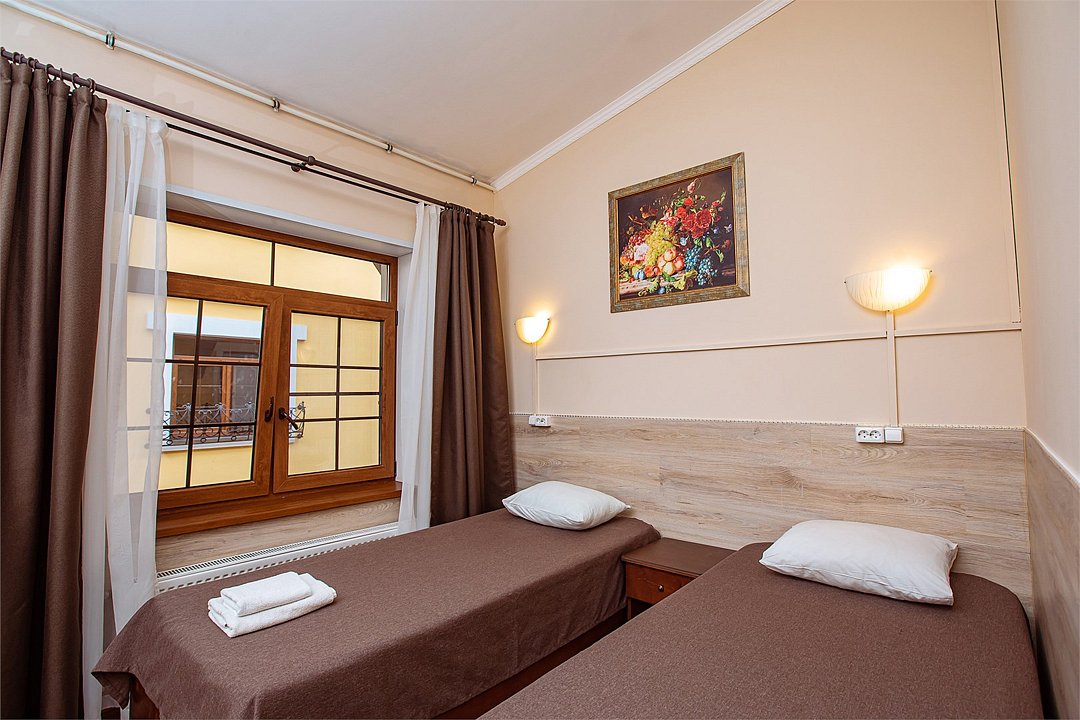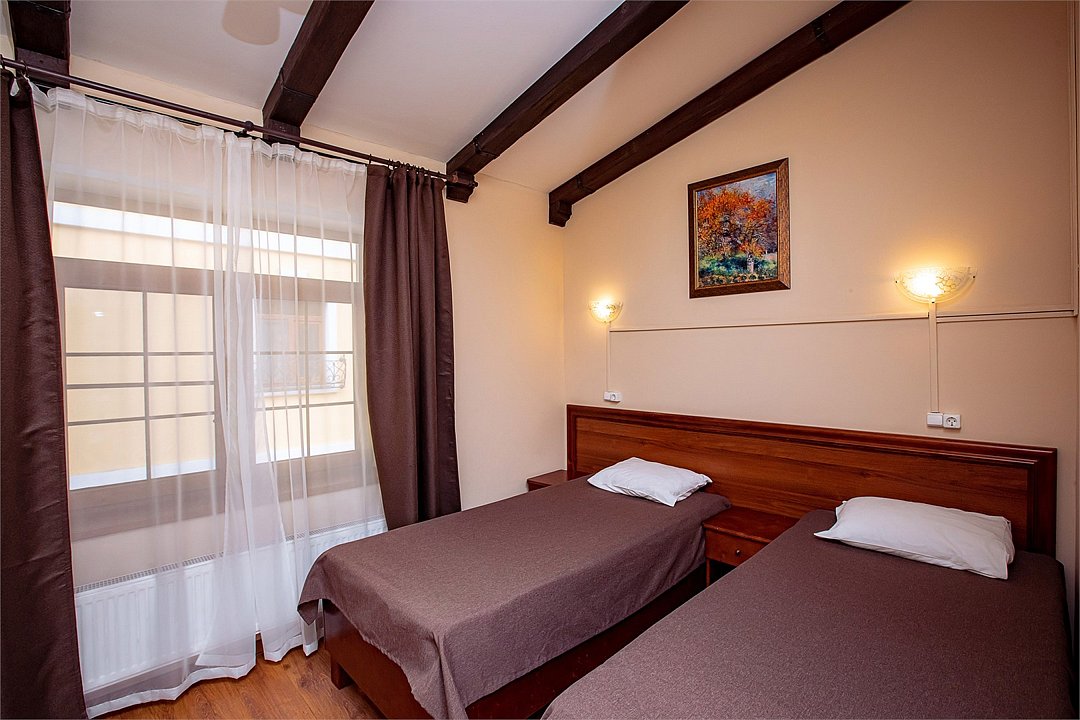 Уютный номер для двоих с видом на внутренний двор Этот номер создан для вашего комфортного отдыха и идеально подойдет для размещения одного или двух гостей. Насладитесь спокойствием, наблюдая за жизнью внутреннего дворика отеля прямо из окна. Что вас ждет в номере: Две удобные раздельные кровати для полноценного сна. Поддержание комфортной температуры благодаря центральному отоплению. Просторный шкаф или гардероб с достаточным количеством вешалок для ваших вещей. Зеркало для вашего удобства. Современный телевизор с плоским экраном для вечернего отдыха. Холодильник для хранения напитков и продуктов. Удобный рабочий стол со стулом, если вам понадобится уделить время делам. В вашей собственной ванной комнате: Душ, туалет Фен для укладки волос. Свежие полотенца Дополнительные удобства в отеле: Круглосуточный доступ к кулеру с питьевой водой (горячей и холодной).Услуги и удобства