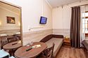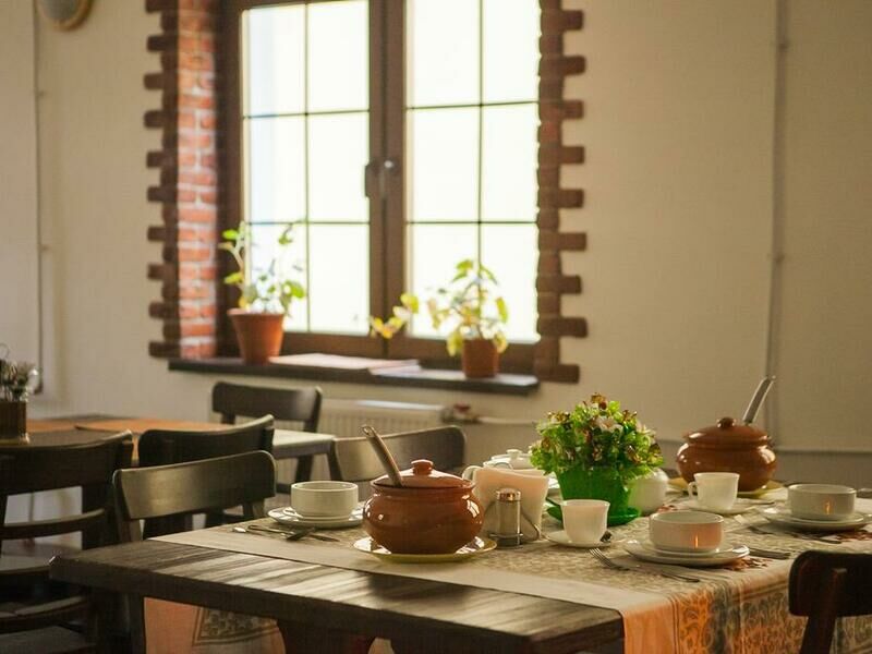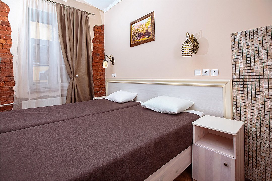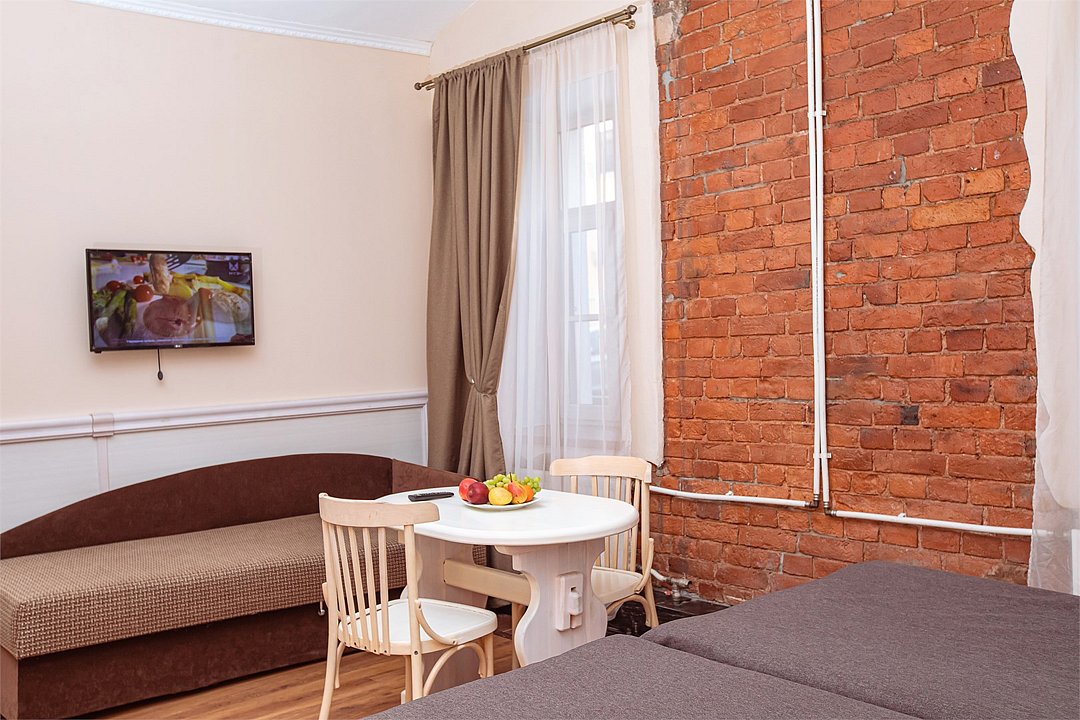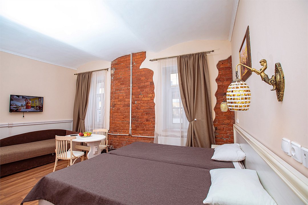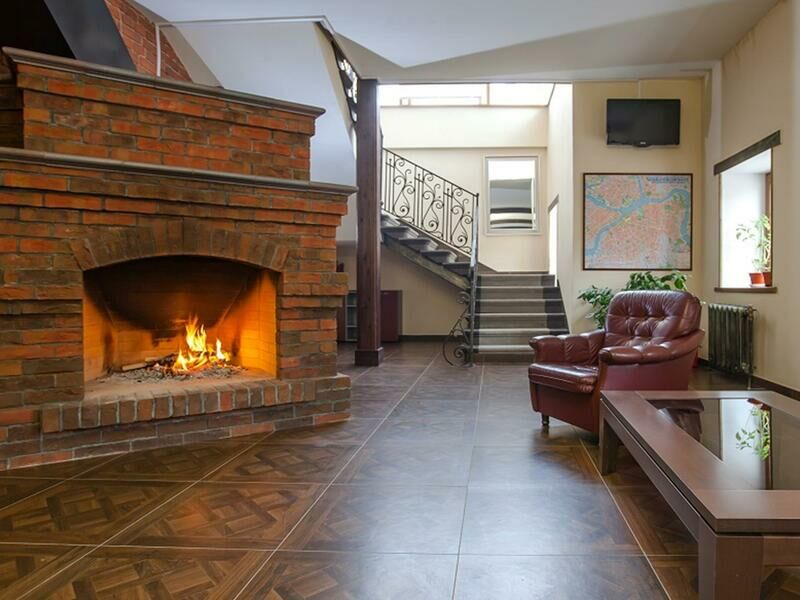 Элементы старинной кирпичной кладки в сочетании с высоким качеством отделки создают оригинальный стиль интерьера отеля, украшением которого являются два действующих камина. Доброжелательные администраторы в распоряжении гостей отеля 24 часа в сутки в лучших традициях петербургского гостеприимства. Зимнее и летнее кафе отеля предлагают постояльцам блюда традиционной русской кухни. (c 8-00 до 23-00 )
