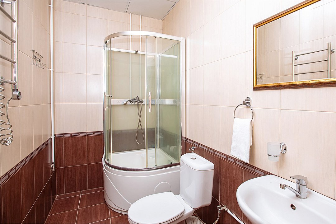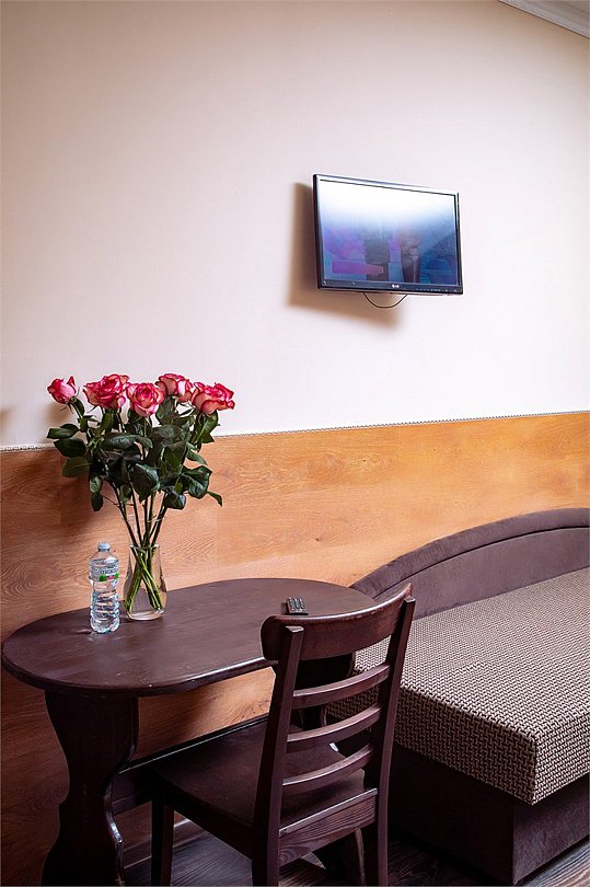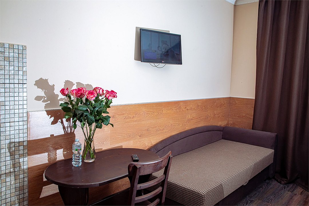 Однокомнатный номер с удобствами. Две односпальные кровати. Телевизор, холодильник, фен. Душевая кабина.Wi-fi в номере.Доп.место кровать/диван/еврораскладушка