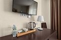 телевизор, Wi-Fi, телефон, две односпальные или большая двуспальная кровать, шкаф для одежды, багажная тумба, зеркало, пуфики, питьевая вода, отопление, ламинат, стаканы, стул, номер для некурящих, уборка номера, услуги прачечной (платно), вешалки-плечики, бутилированная вода, без питомцевВ гостиничном номере