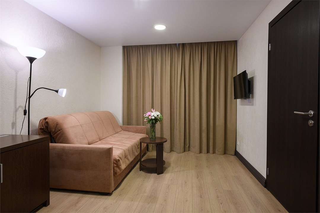 ванна или душевая кабина, санузел, халаты, банные полотенца, тапочки, косметические средства, шкаф для одежды, вешалки, журнальный столик, багажная тумба, зеркало, две комнаты, чайный набор, раковина, косметическое зеркало, отопление, ламинат, стаканы, стул, тумба, туалетные средства, туалет, раскладной диван, номер для некурящих, рабочий стол, чайная станция, уборка номера, услуги прачечной (платно), вешалки-плечики, бутилированная вода, шапочка для душа, можно с питомцамиВ гостиничном номере