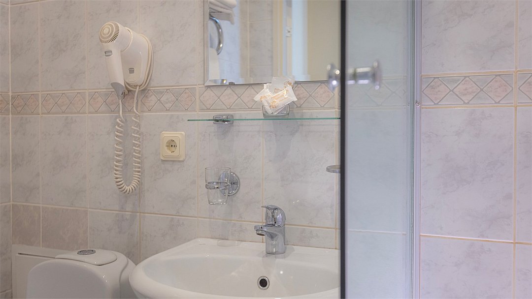 телевизор, Wi-Fi, кондиционер, светильник, фен, обогреватель, ванная комната, душевая кабина, санузел, банные полотенца, косметические средства, кровать «King size», стулья, вешалки, письменный стол, багажная тумба, зеркало, вид на город, кулер на этаже, вид во двор, внутренний телефон, мини-холодильник, без питомцевВ номере