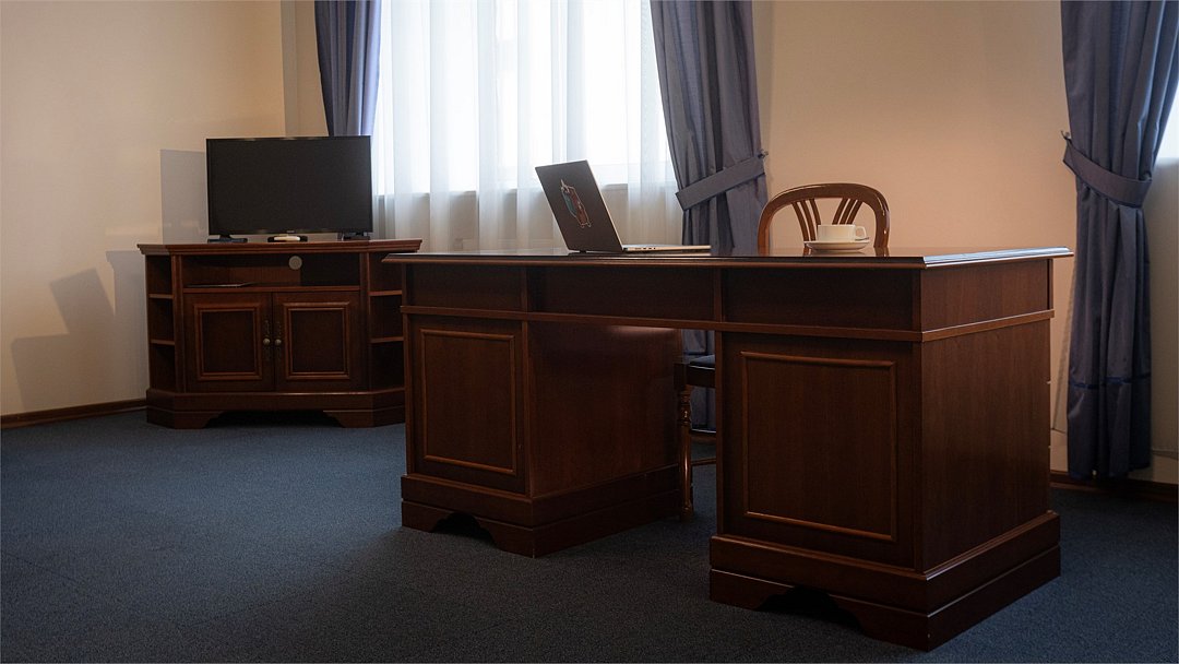 телевизор, Wi-Fi, кондиционер, настольные лампы, фен, обогреватель, санузел, банные полотенца, косметические средства, кровать «King size», диван, шкаф для одежды, вешалки, журнальный столик, письменный стол, багажная тумба, зеркало, комод, две комнаты, сейф, чайник, раковина, отопление, душ, вид на город, кулер на этаже, кресло, вид во двор, стаканы, внутренний телефон, мини-холодильник, москитная сетка, номер для некурящих, уборка номера, без питомцевВ номере