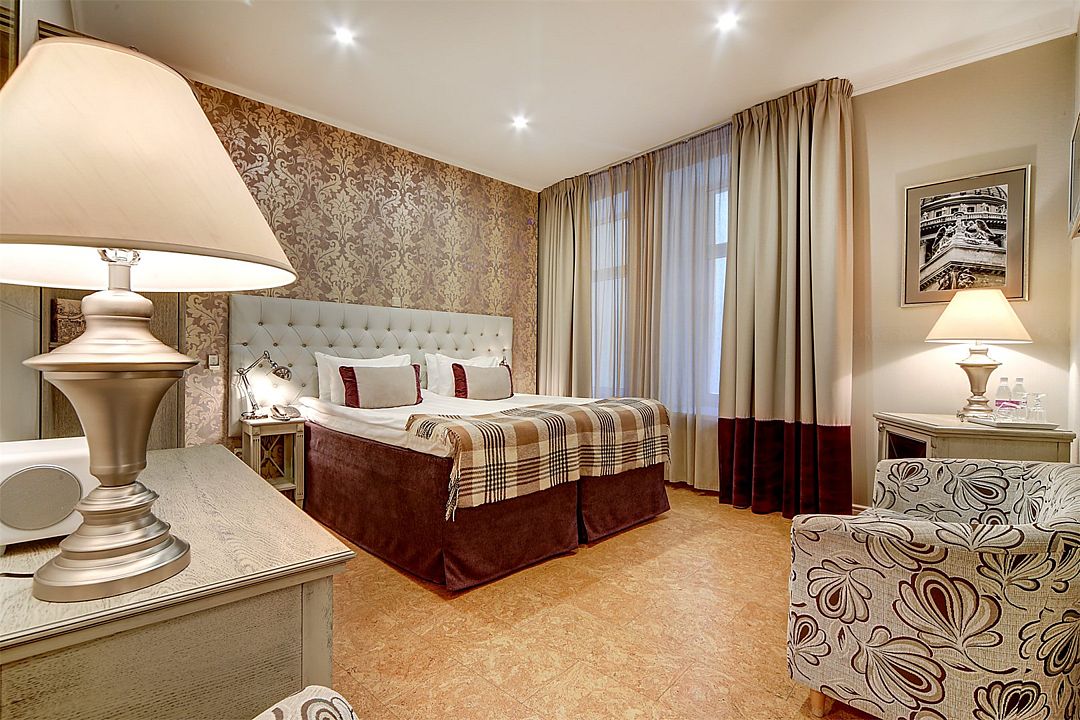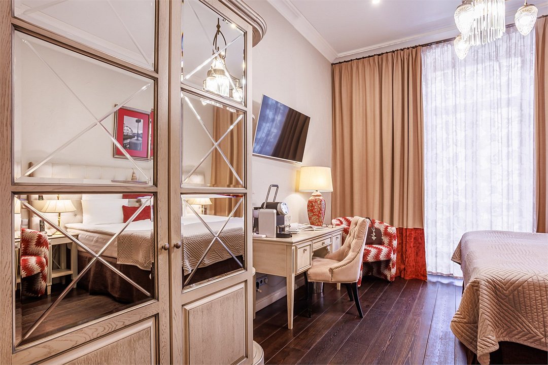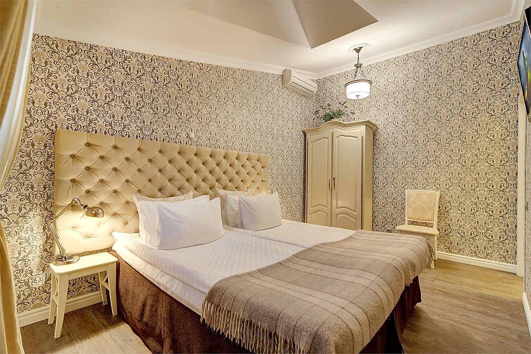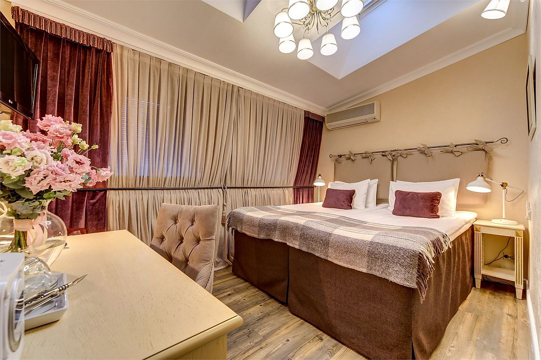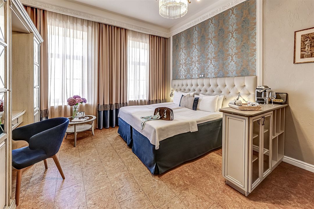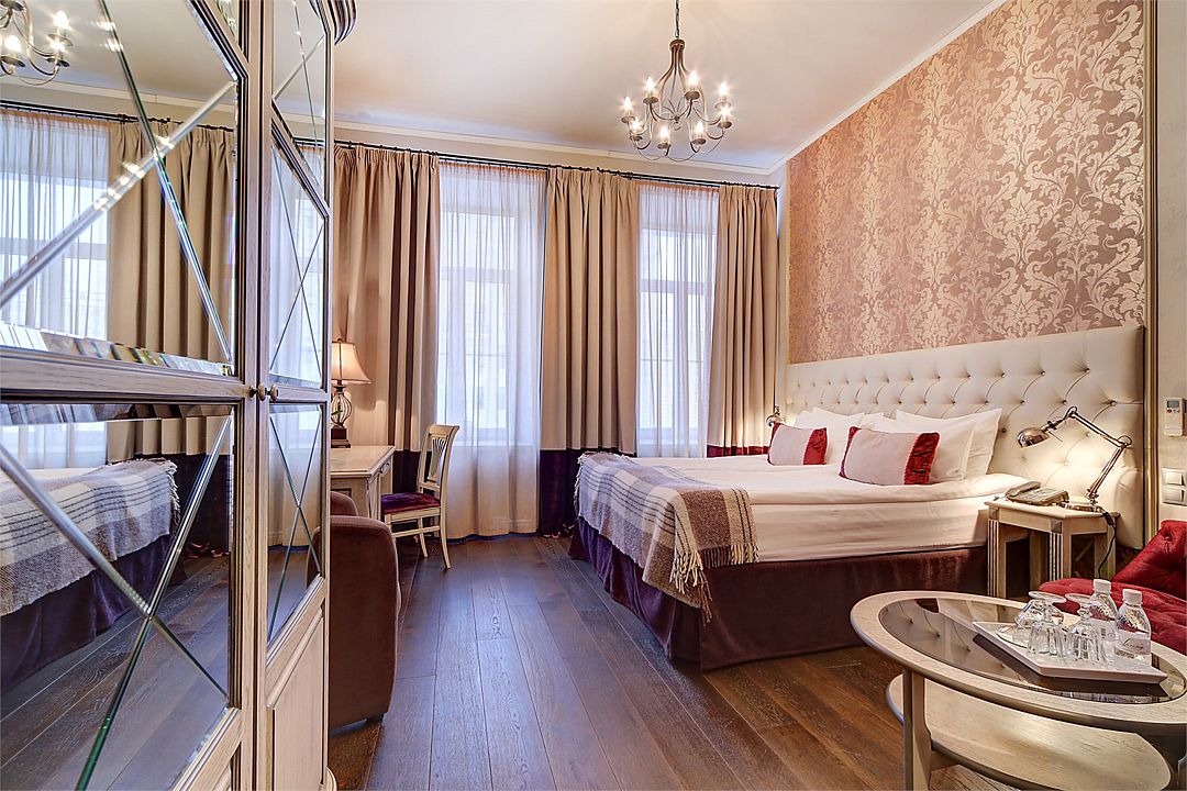 Классический двухместный номер средней площадью 18 кв. м с высоким потолком, большим окном и чудесным видом на набережную реки Мойки и Аракчеевский дворец. Высокие комфортабельные кровати и белье из шелковистого страйп-сатина обеспечат прекрасный сон. Можно выбрать одну двуспальную кровать или две отдельные (Dbl/Twin).Услуги и удобства